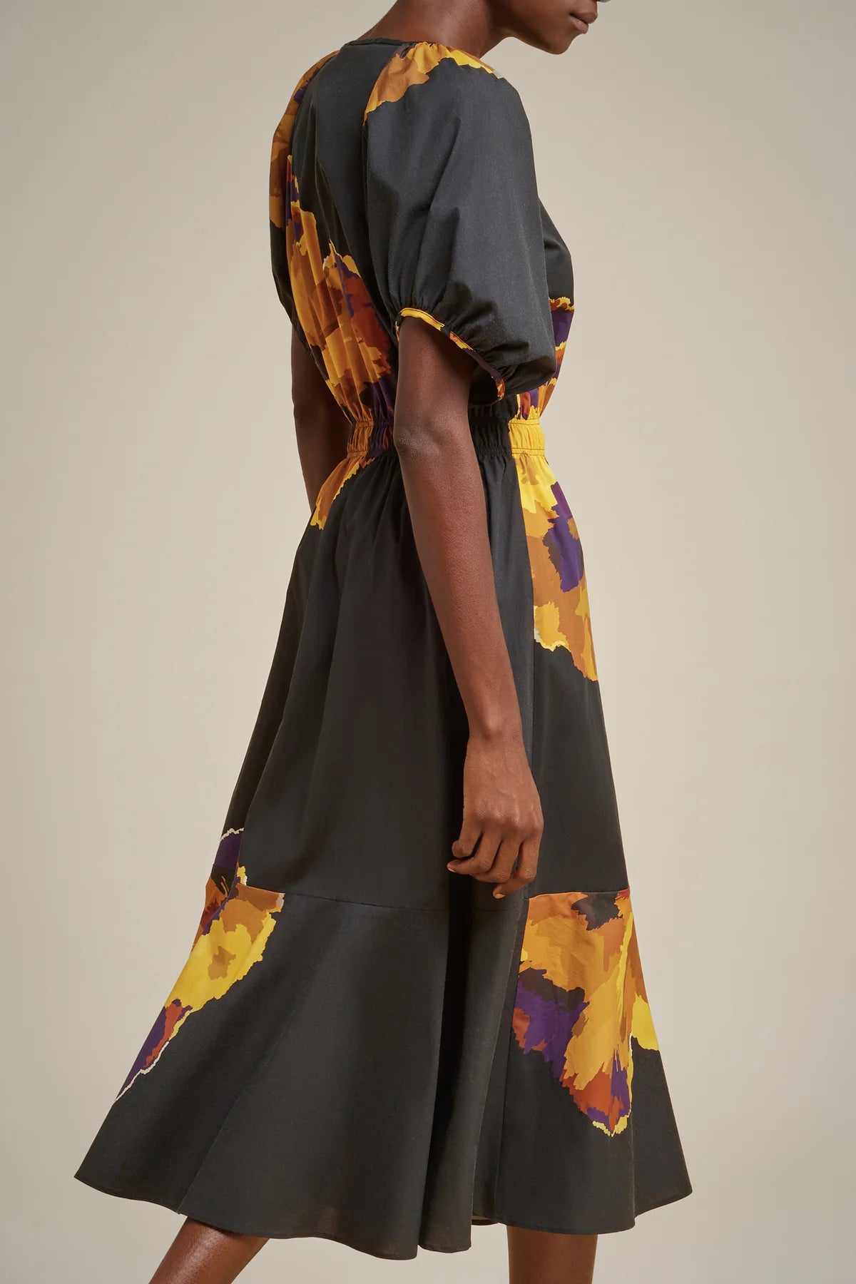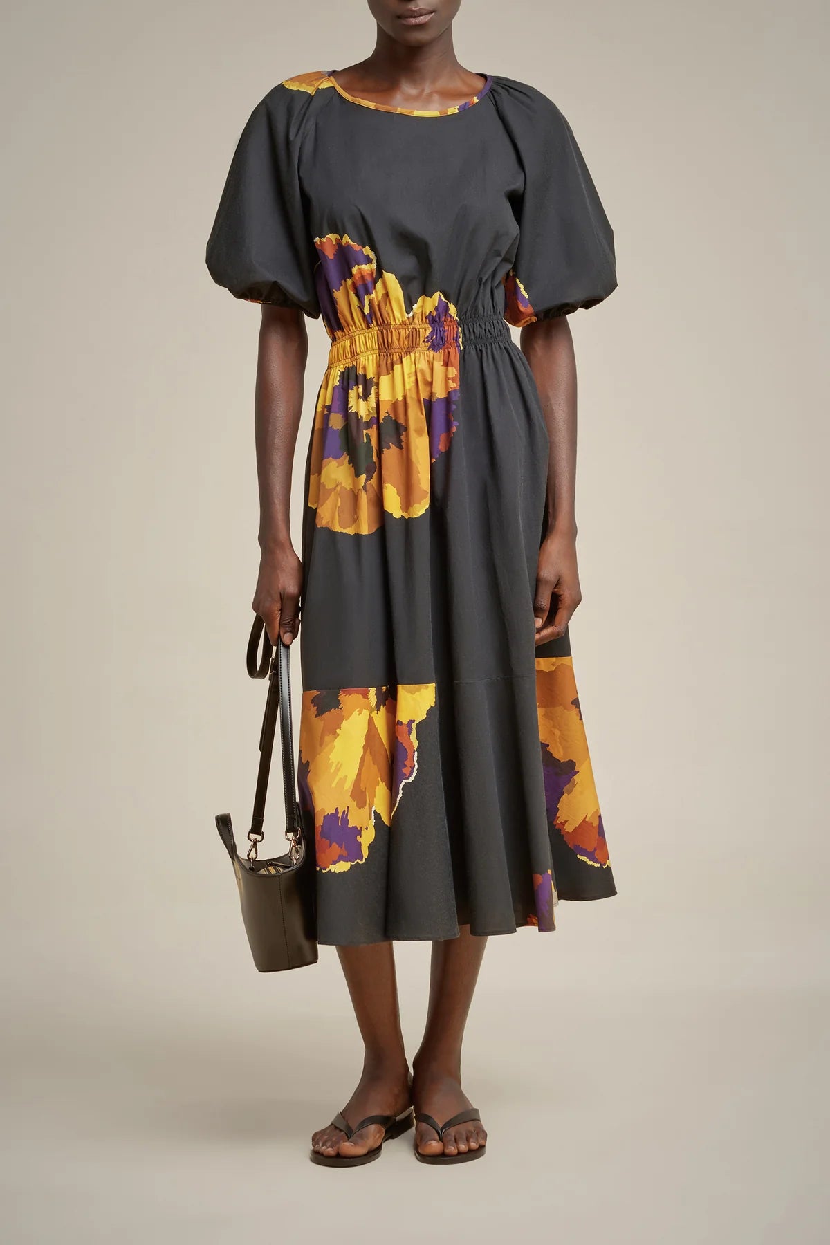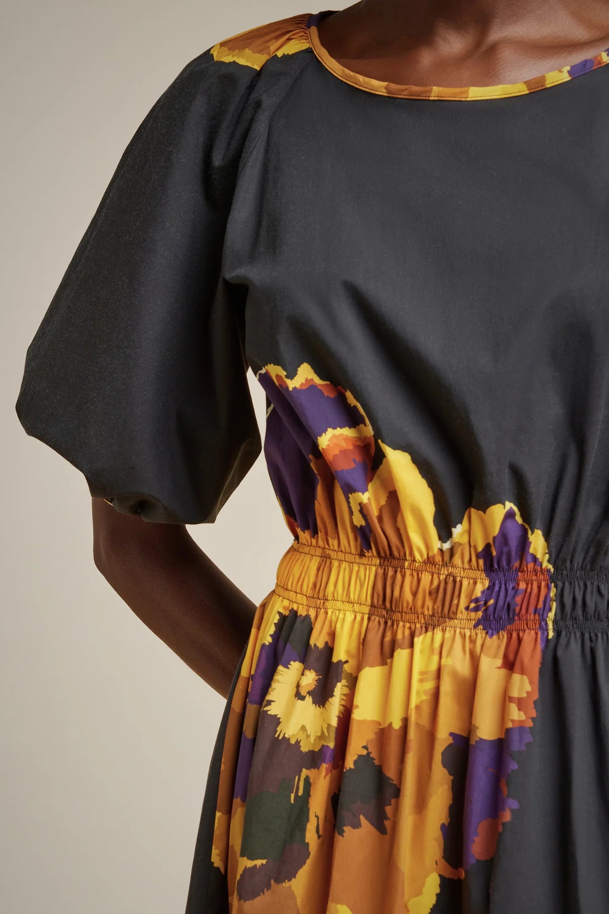 Abito lungo in popeline stampato, girocollo, maniche corte a palloncino, taglio in vita impunturato ed elasticizzato, gonna svasata al fondo