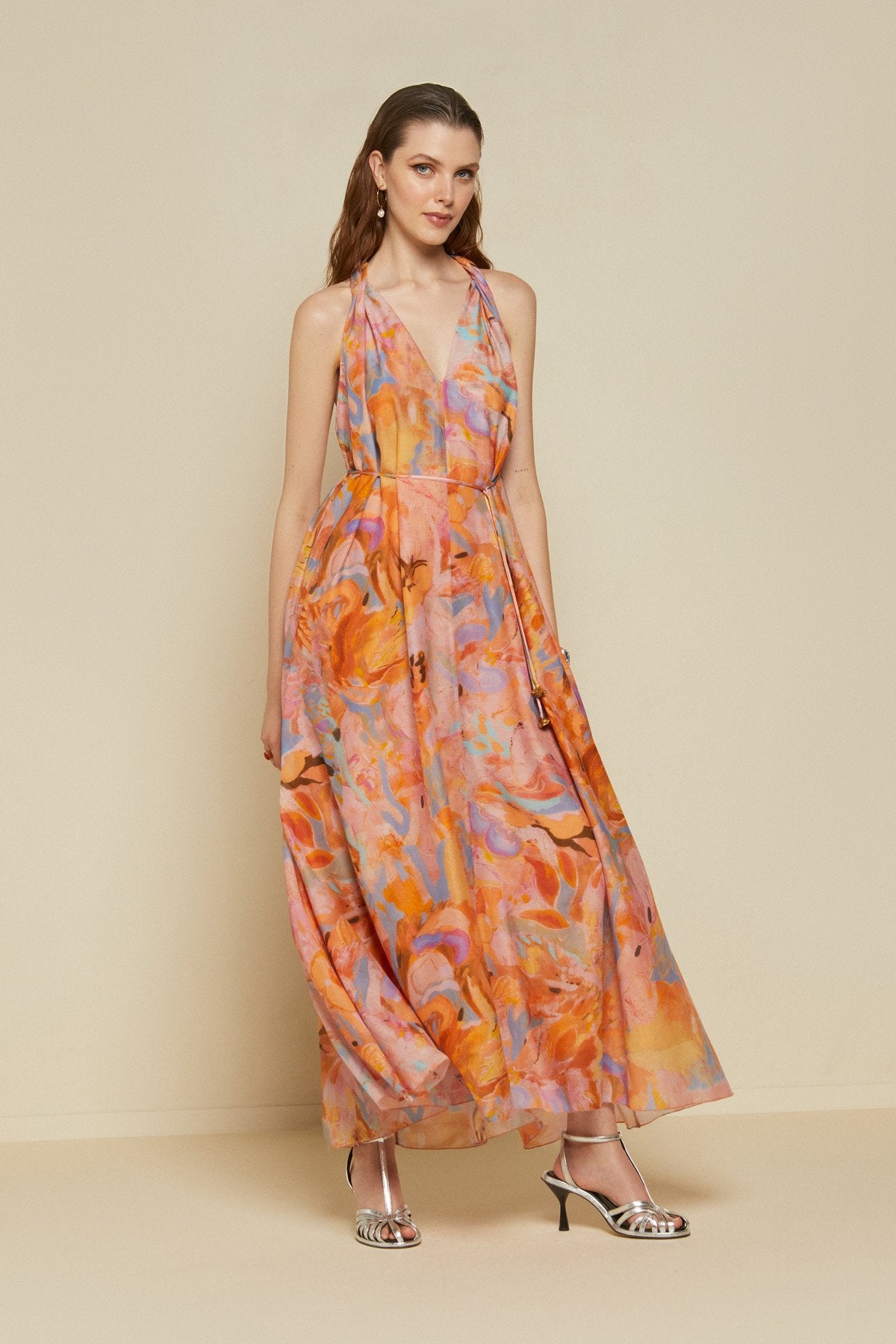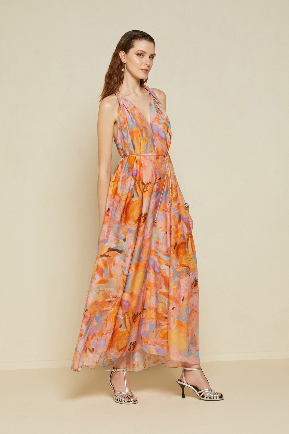 Abito lungo in misto cotone e seta con fantasia floreale, scollo a foulard e cintura