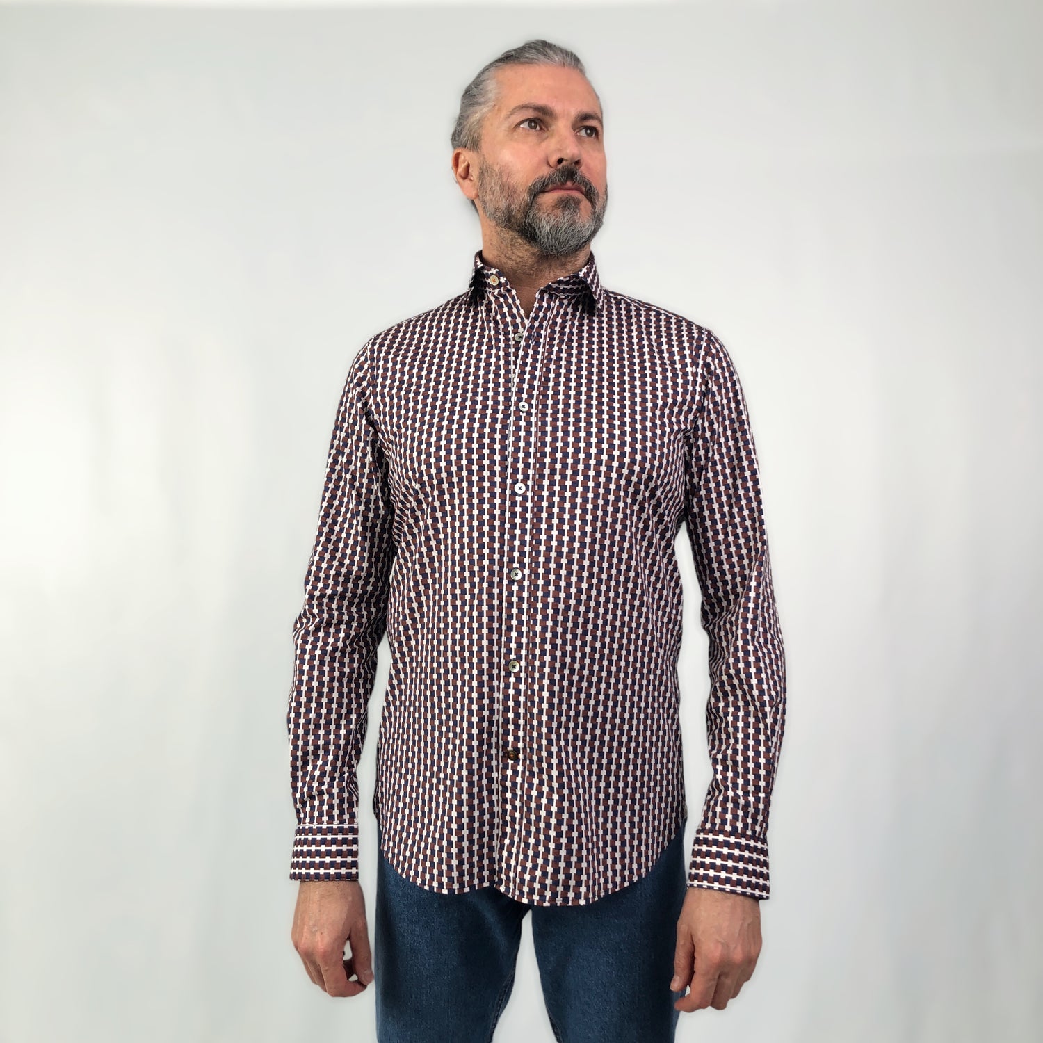 Cod.02CA-FIO2573 Camicia in cotone stretch a fantasia optical con maniche lunghe, collo francese e bottoni in madreperla. Perfetta con pantaloni sportivi, jeans e bermuda. Da indossare anche con le maniche arrotolate.