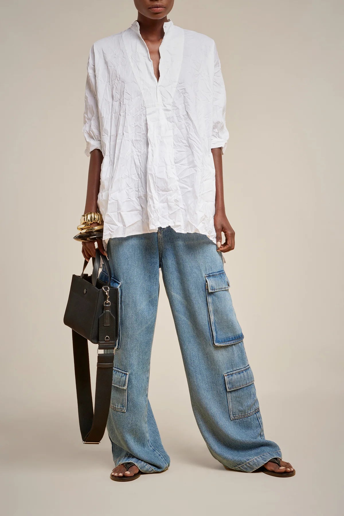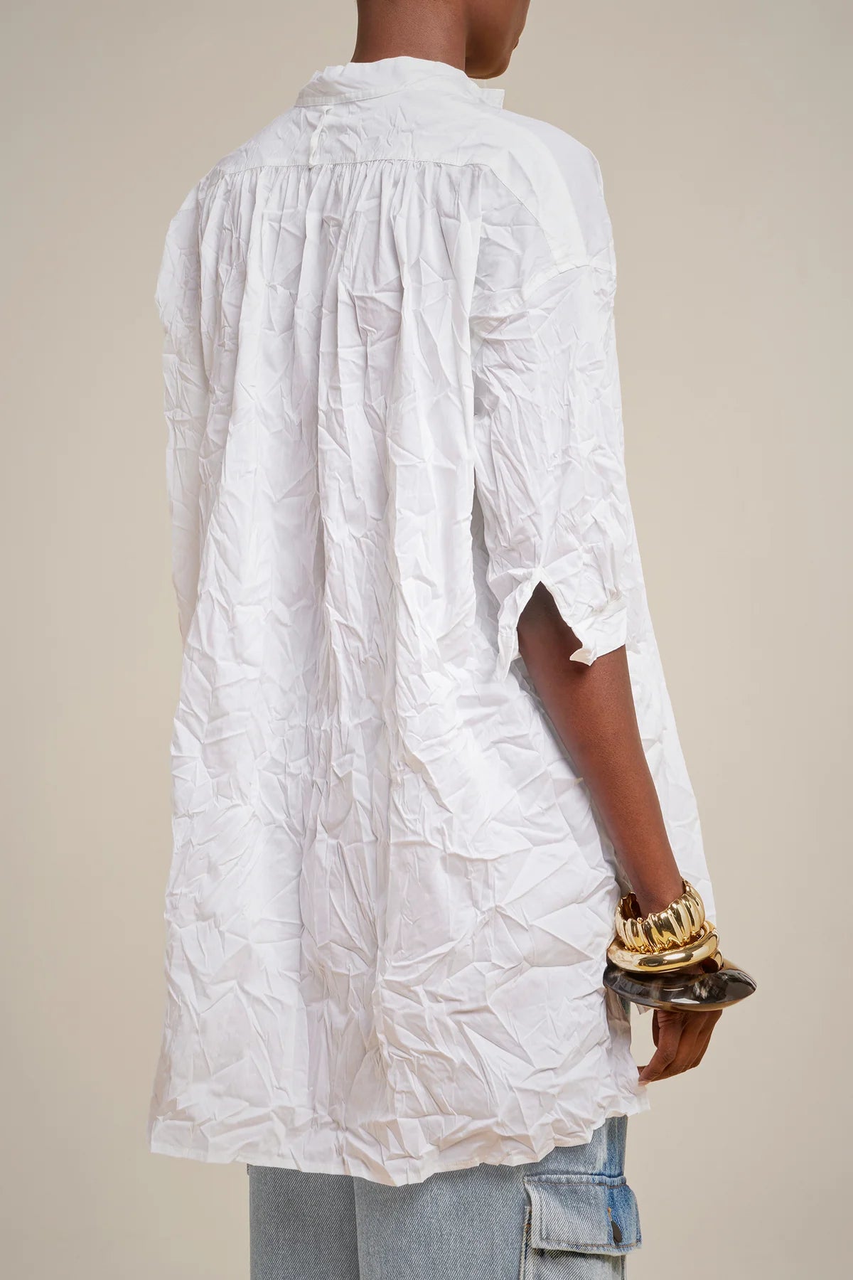 Camicia in popeline stretch effetto crinkle, collo coreana con apertura a v, spalla bassa e manica corta con polsino al fondo, piega davanti, spacchetti laterali al fondo