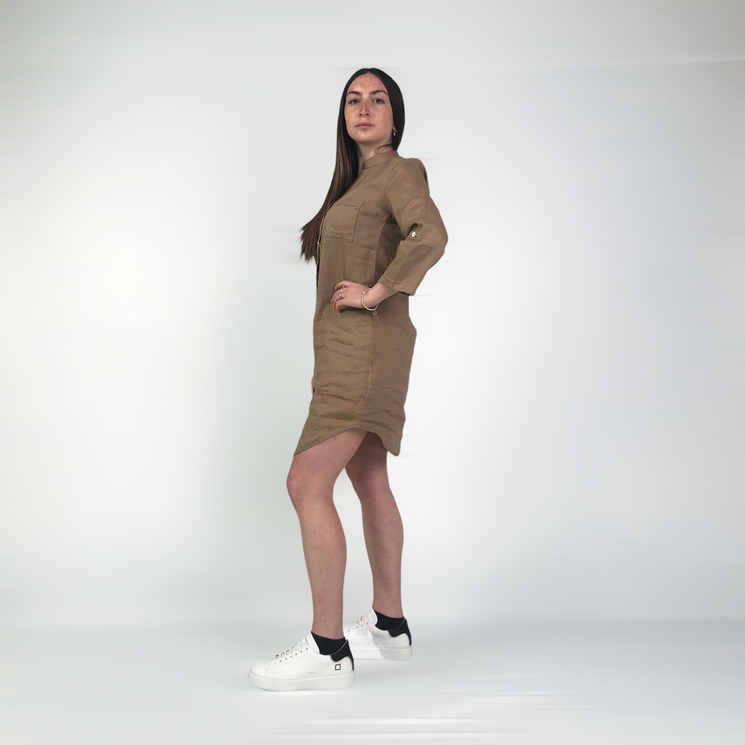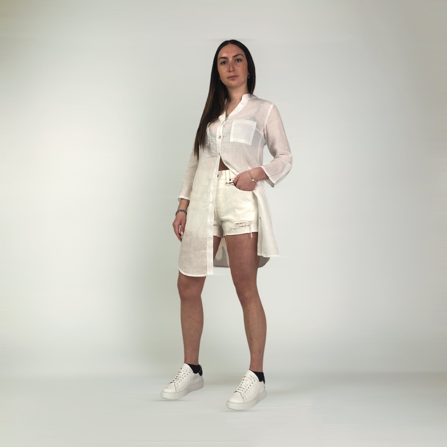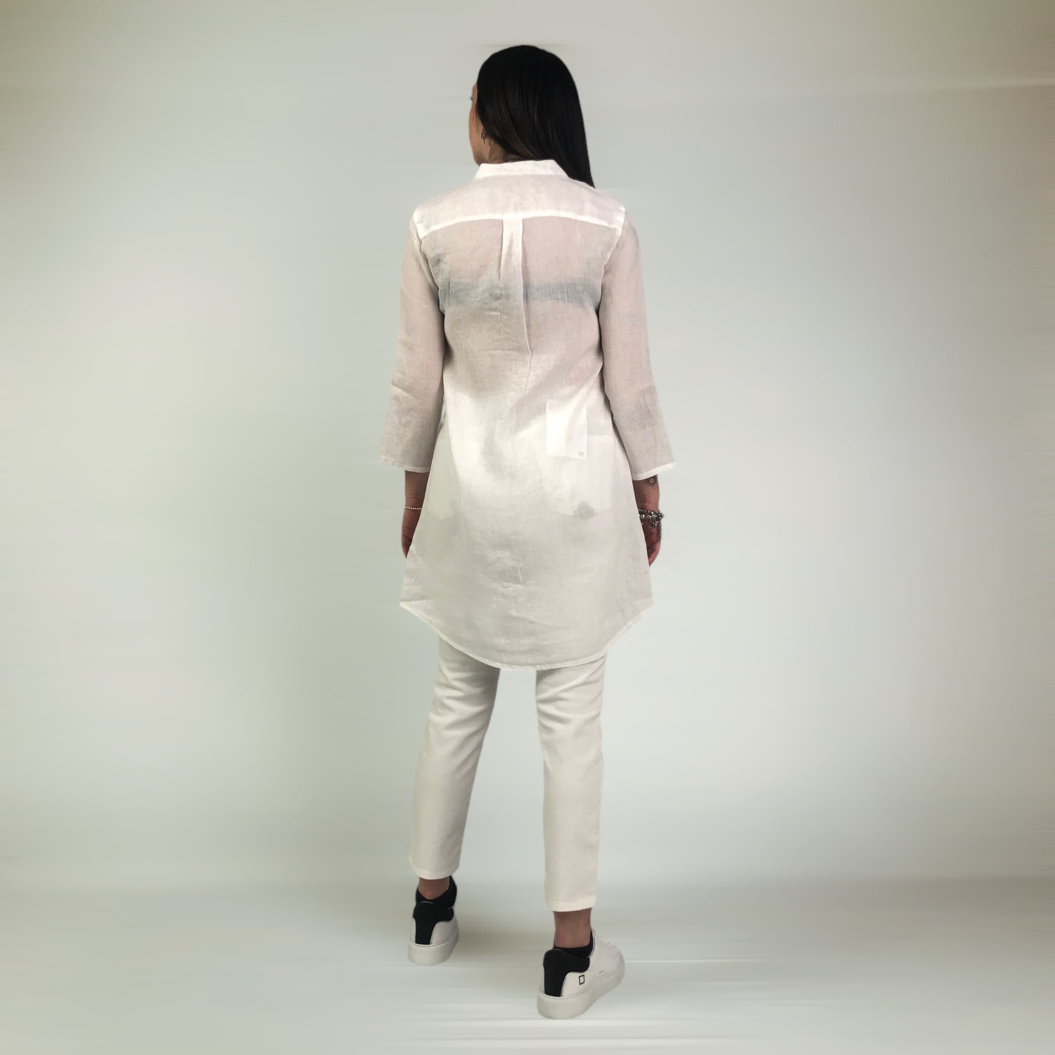 Cod.07CA-LINEN Camicia over in lino dalla linea sagomata con scollo a V e colletto aperto alla coreana. Taschini sul seno, maniche 3/4 con possibilità di arrotolarle e fermarle con un cinturino con bottone. Fondo stondato, chiusa con bottoni in madreperla. Cannoncino sul dietro per una maggiore vestibilità.