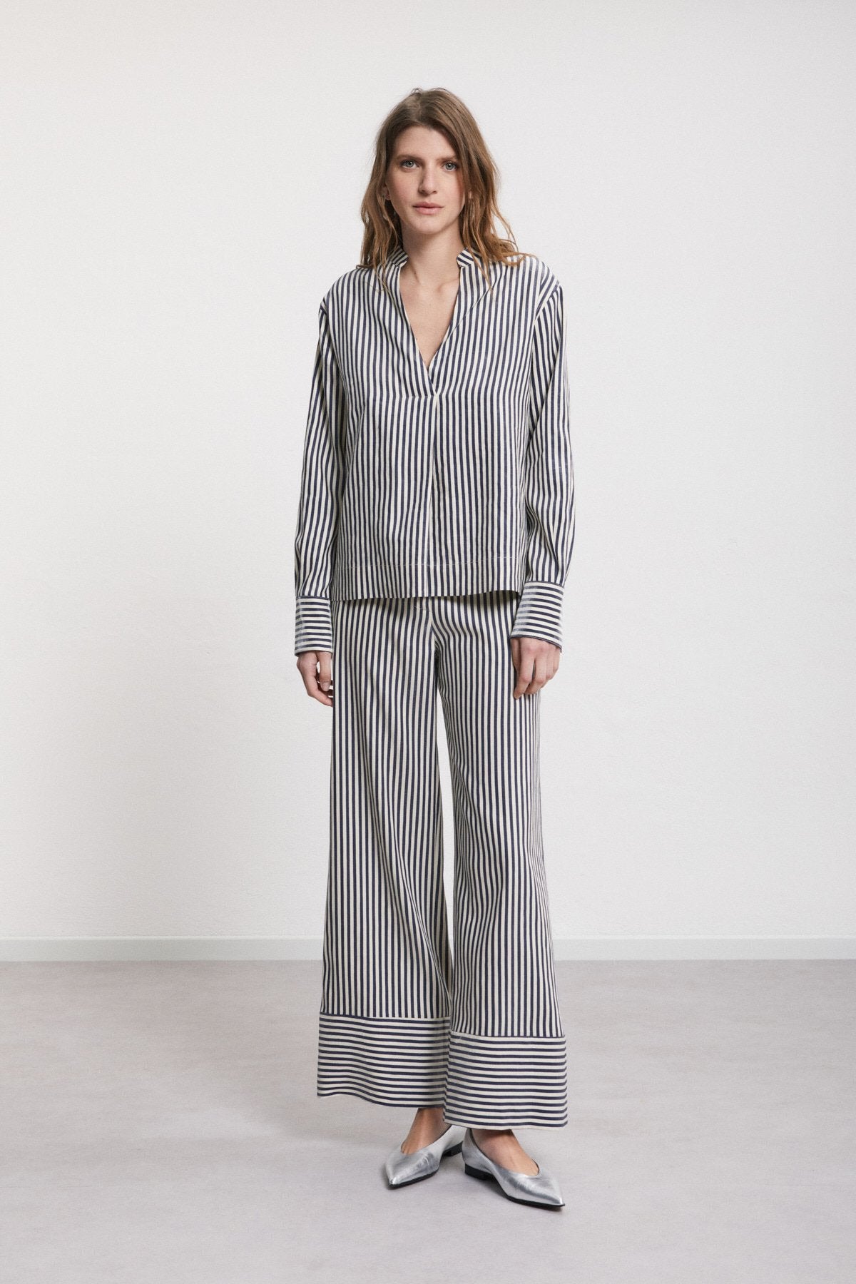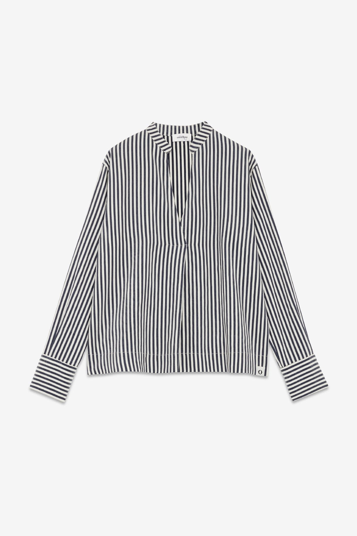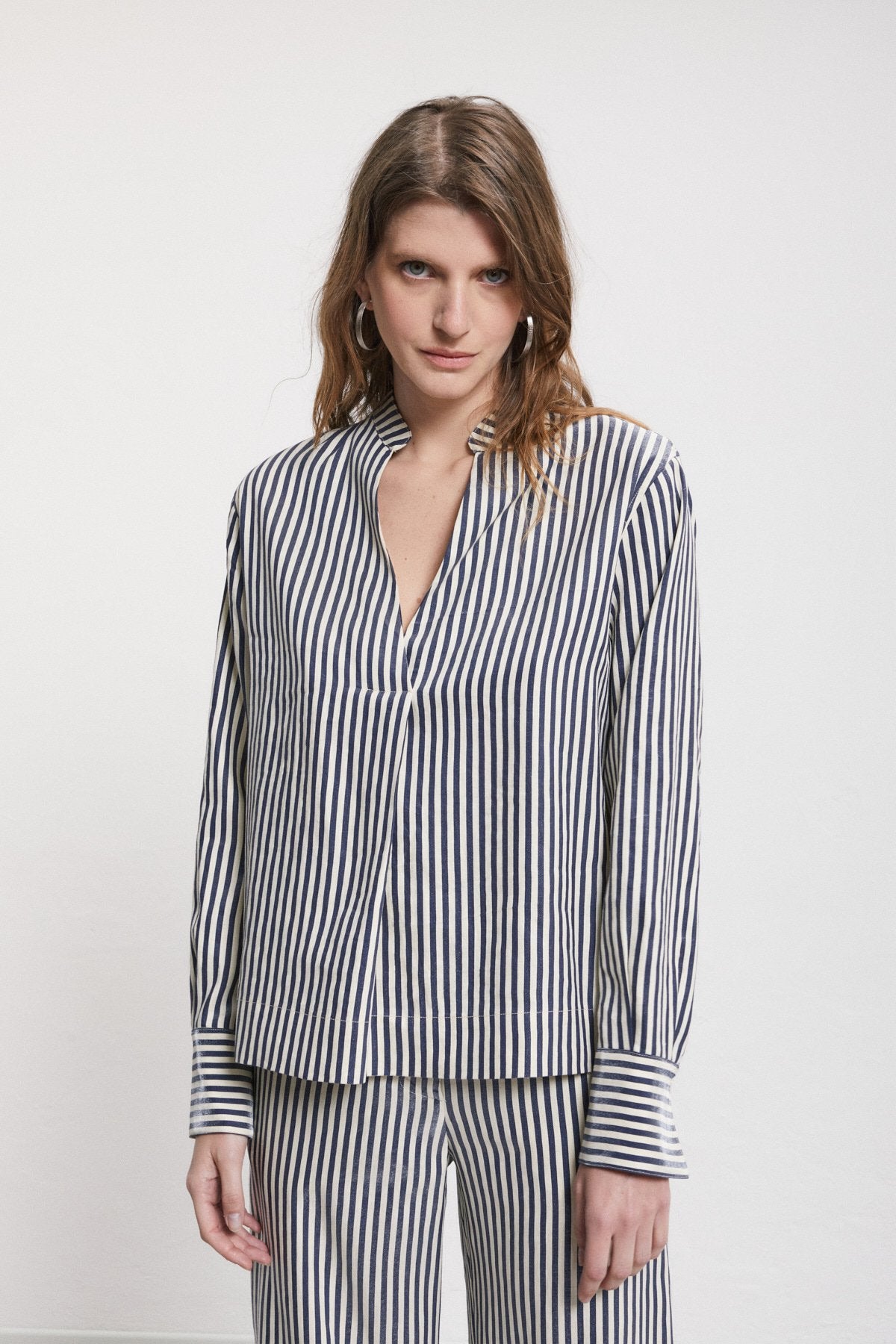 Sfoggia uno stile elegante e alla moda con la nostra camicia righe. Realizzata in lino, presenta un fondo dritto e un moderno collo coreano. Perfetta per un aspetto sofisticato e confortevole.