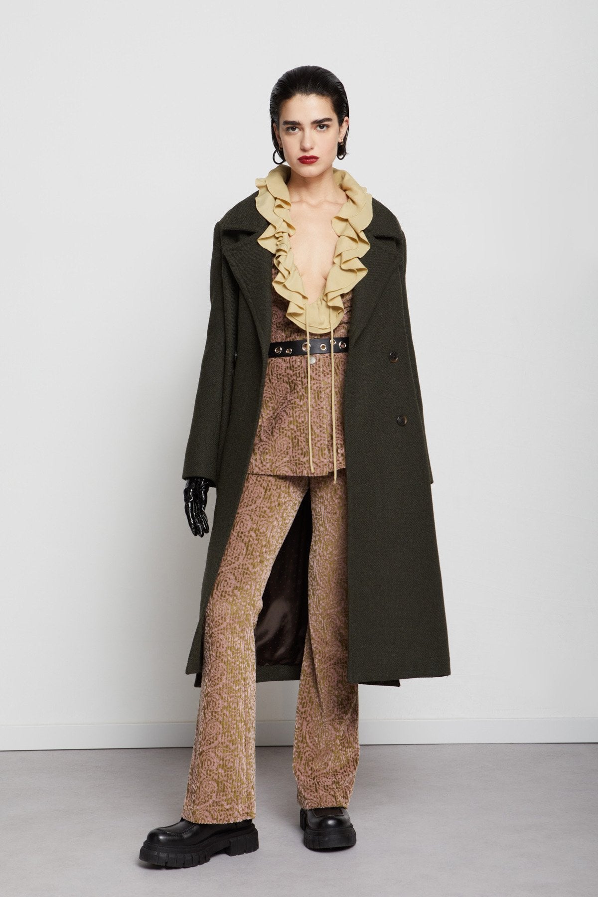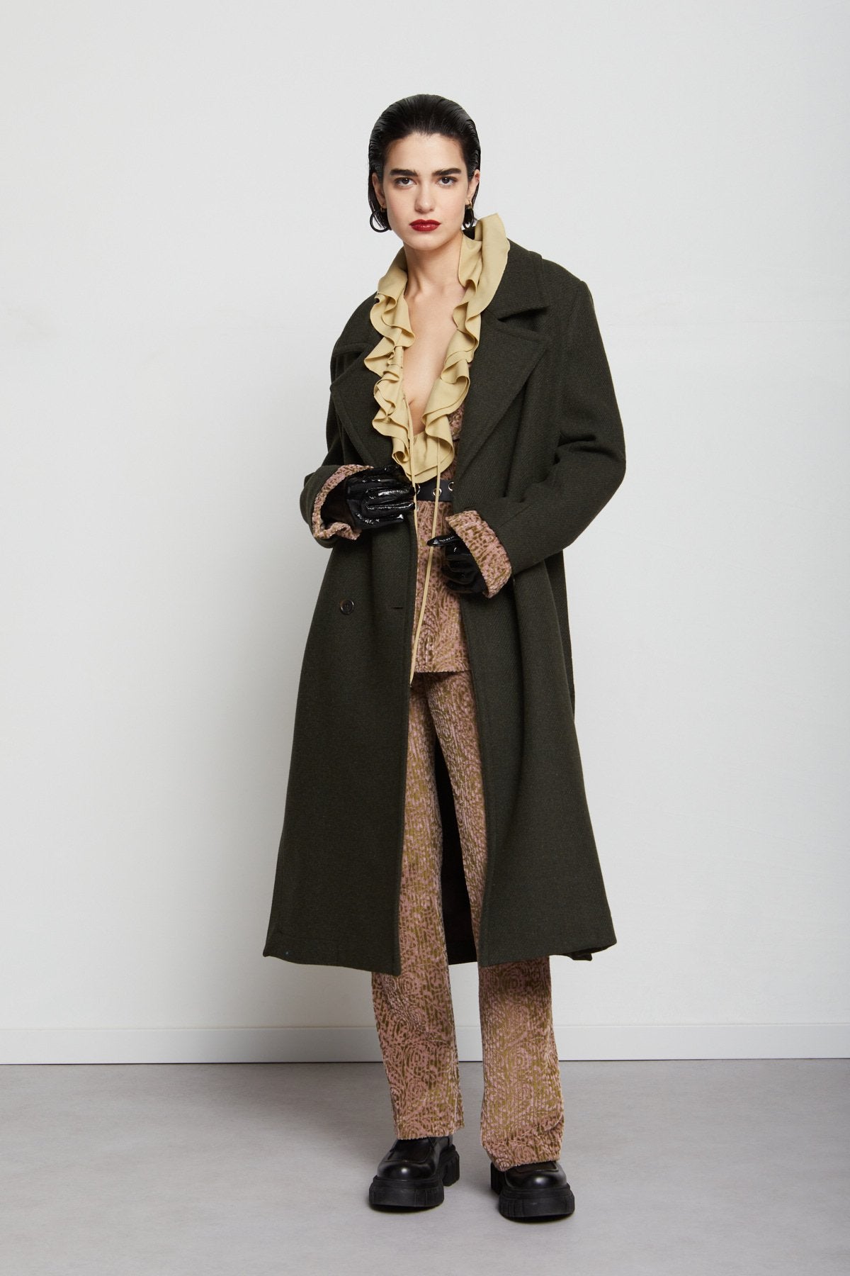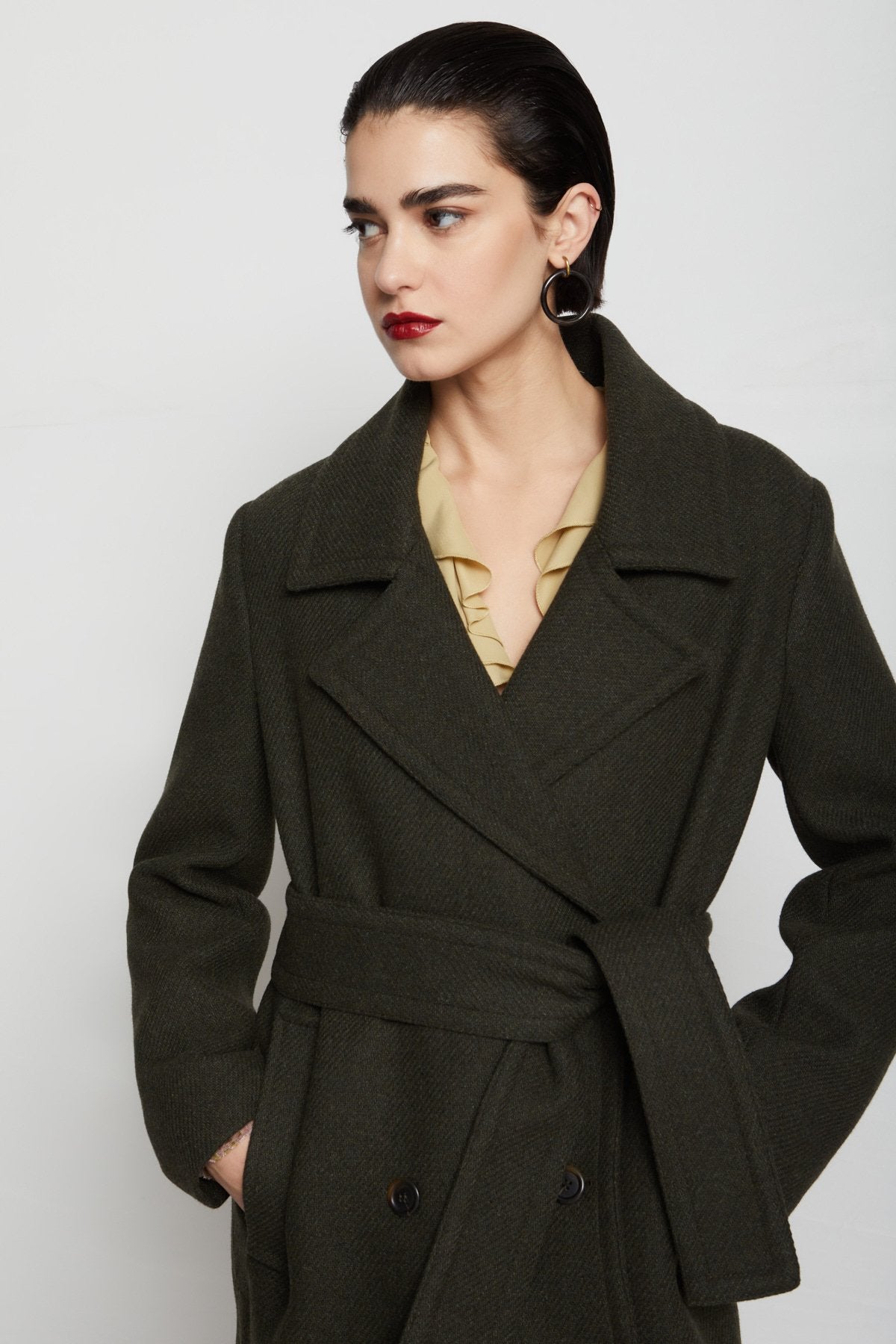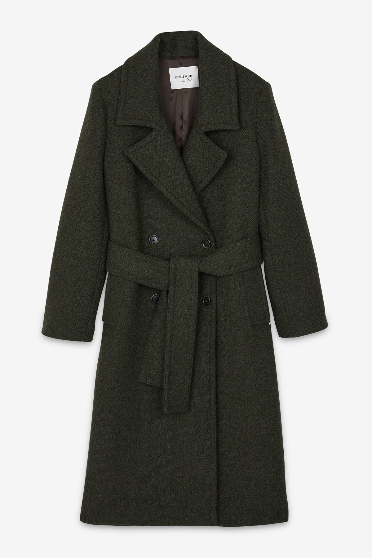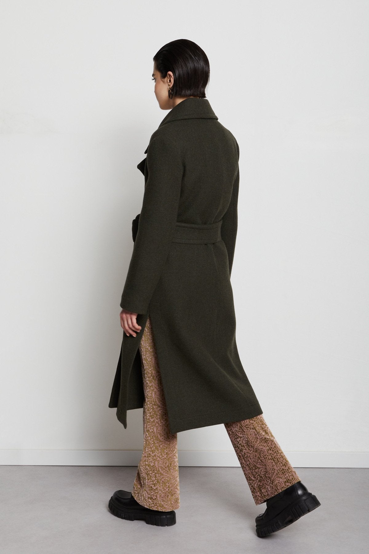 Cappotto lungo in misto lana con spacchi laterali e cintura.