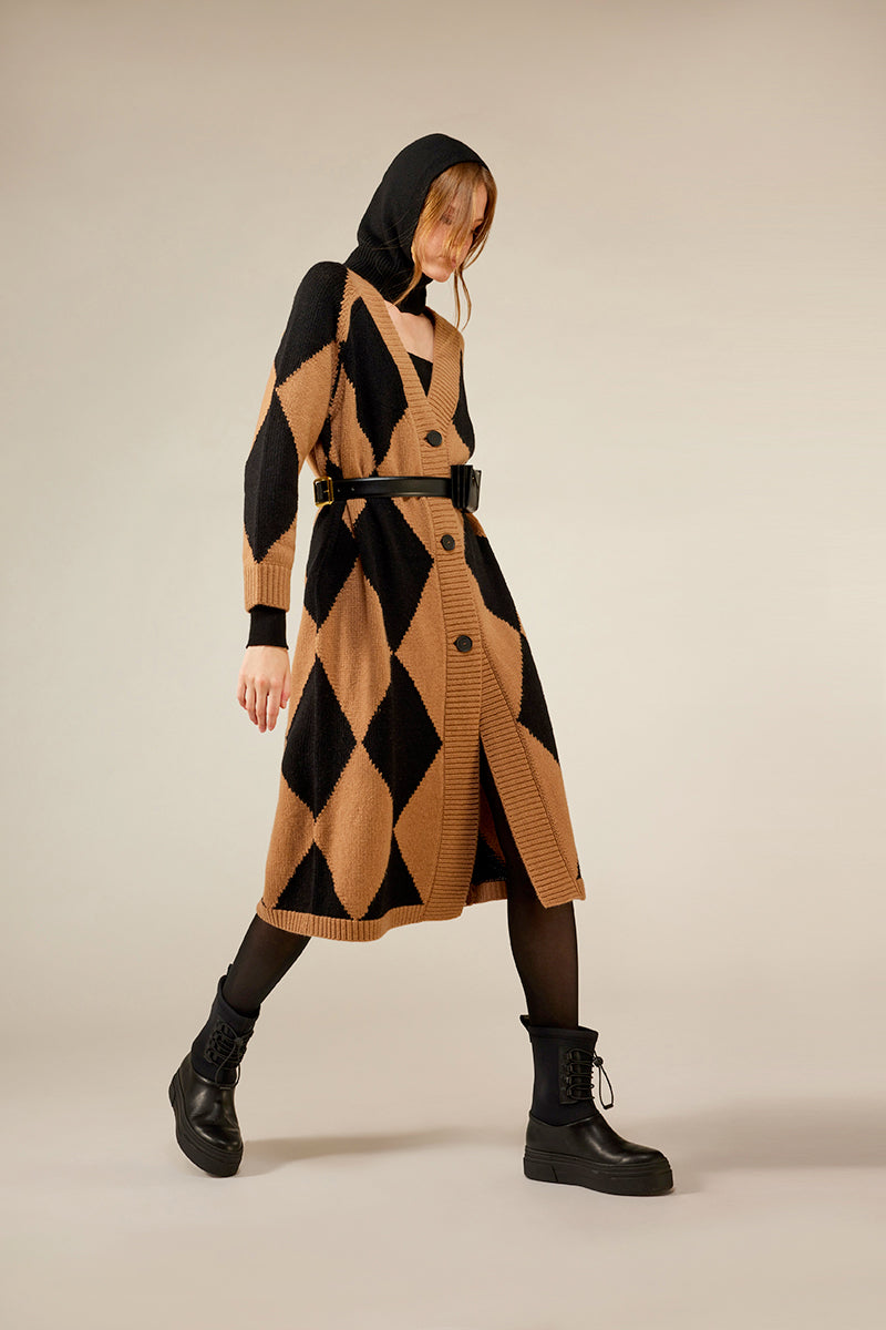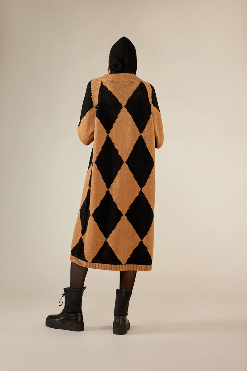 Maxi cardigan a rombi bicolor in cashmere riciclato e lana merinos, collo sciallato con bordo a costina, apertura vis a vis, manica lunga, bordi a coste. Vestibilità over