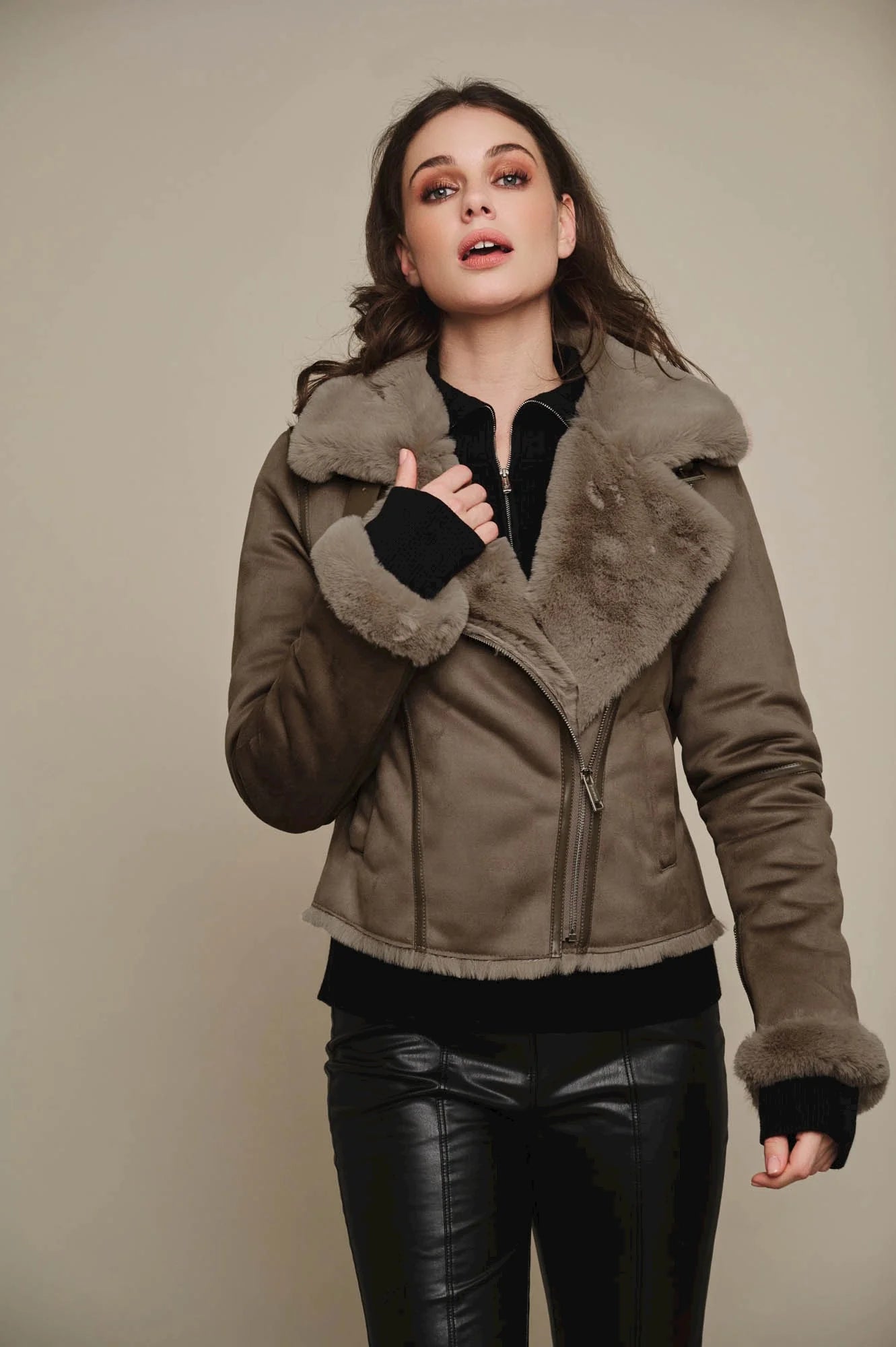 Giubbotto in ecomontone con colletto con revers in pelliccia sintetica con cinturino e fibbia, polsini in pelliccia sintetica con dettagli con cerniera, chiusura con cerniera sul davanti e tasche all'americana con chiusura a bottone.