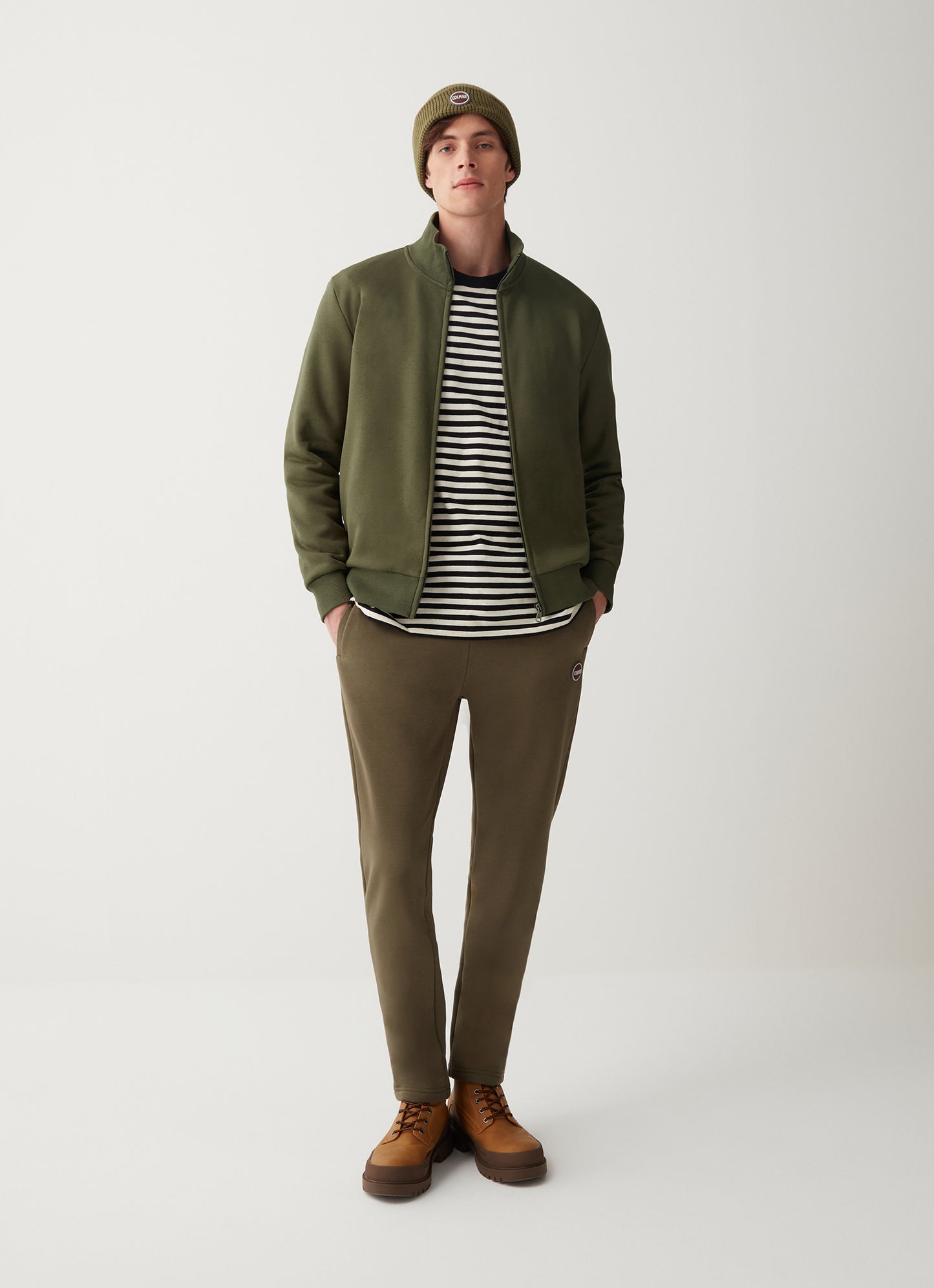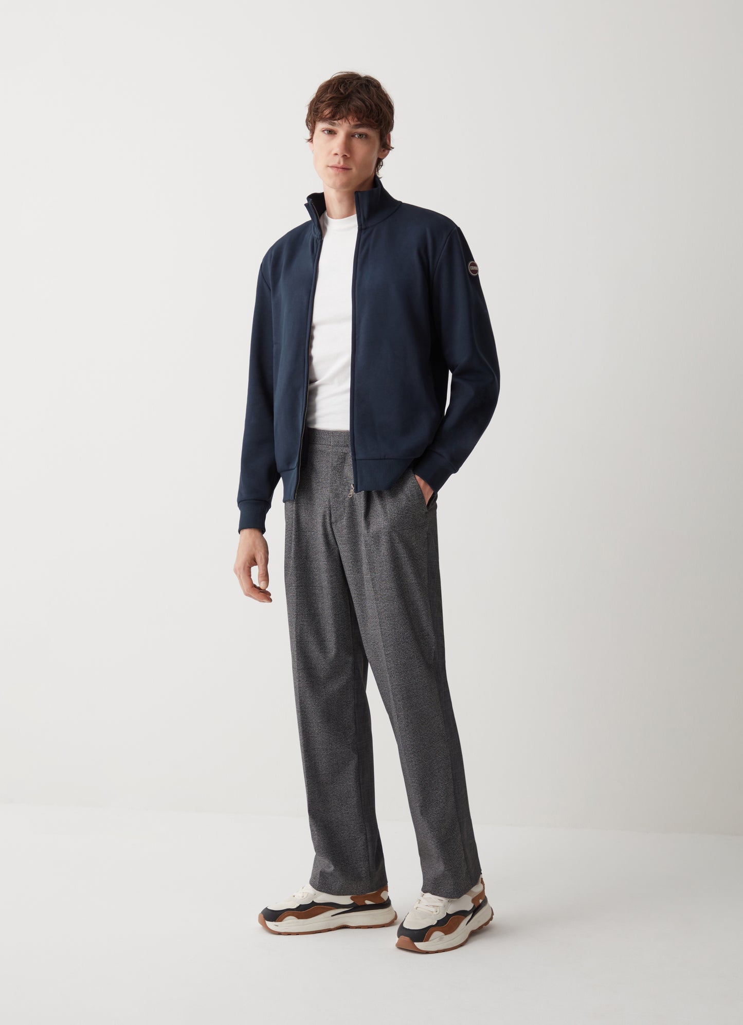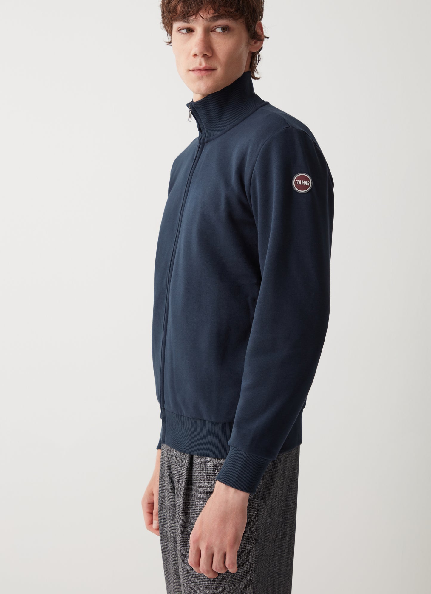 Felpa full zip realizzata in tessuto garzato misto cotone. Ricorda il classico bomber, questo modello con tasche inserite nei fianchi e collo alto. Vestibilità regolare, tasche laterali, logo sulla manica sinistra.
