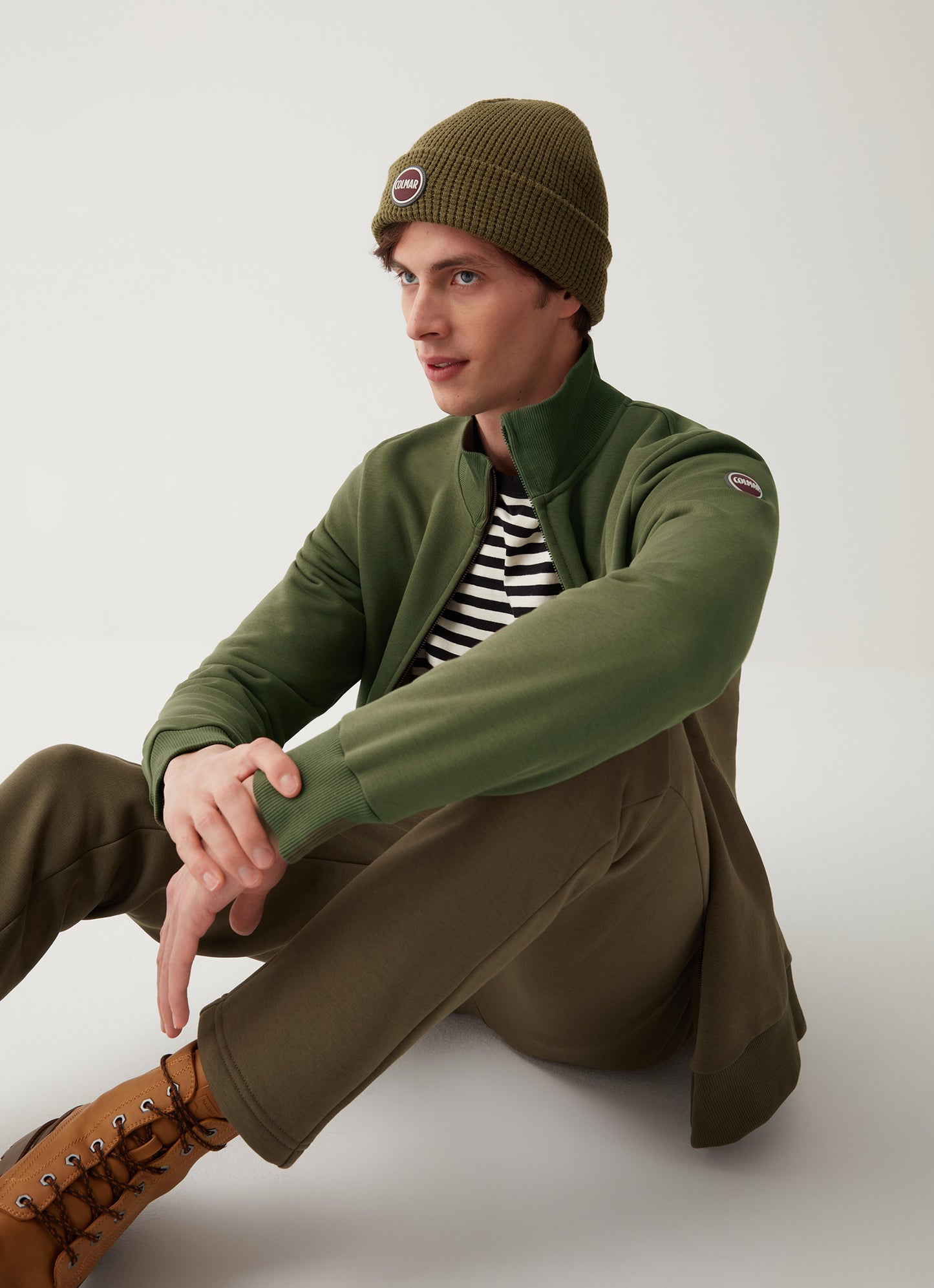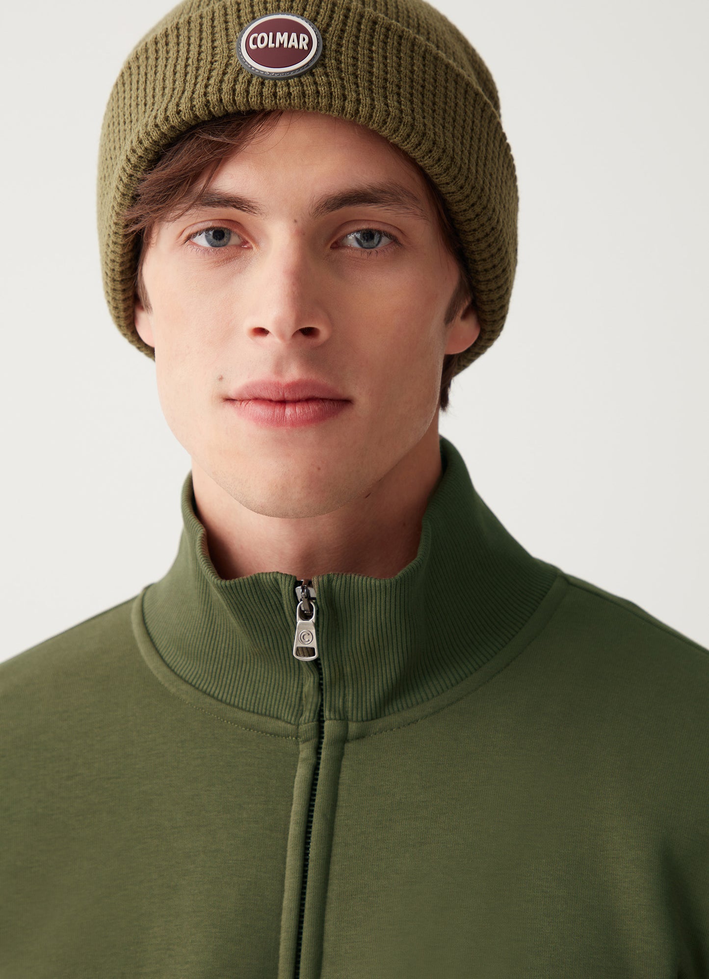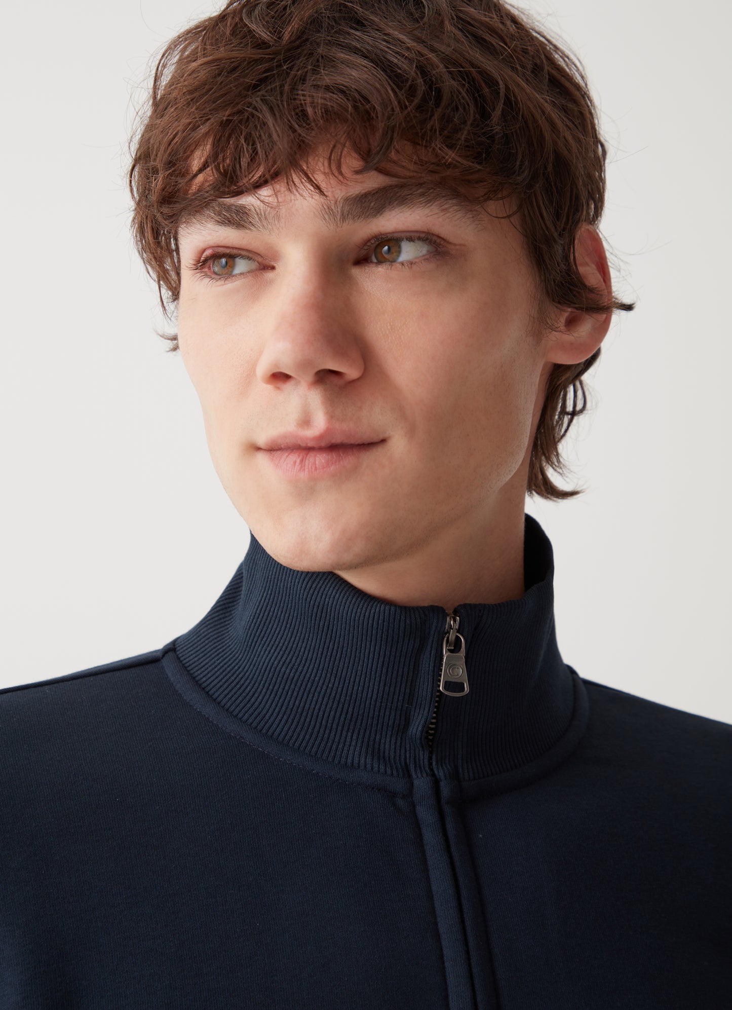 Felpa full zip realizzata in tessuto garzato misto cotone. Ricorda il classico bomber, questo modello con tasche inserite nei fianchi e collo alto. Vestibilità regolare, tasche laterali, logo sulla manica sinistra.