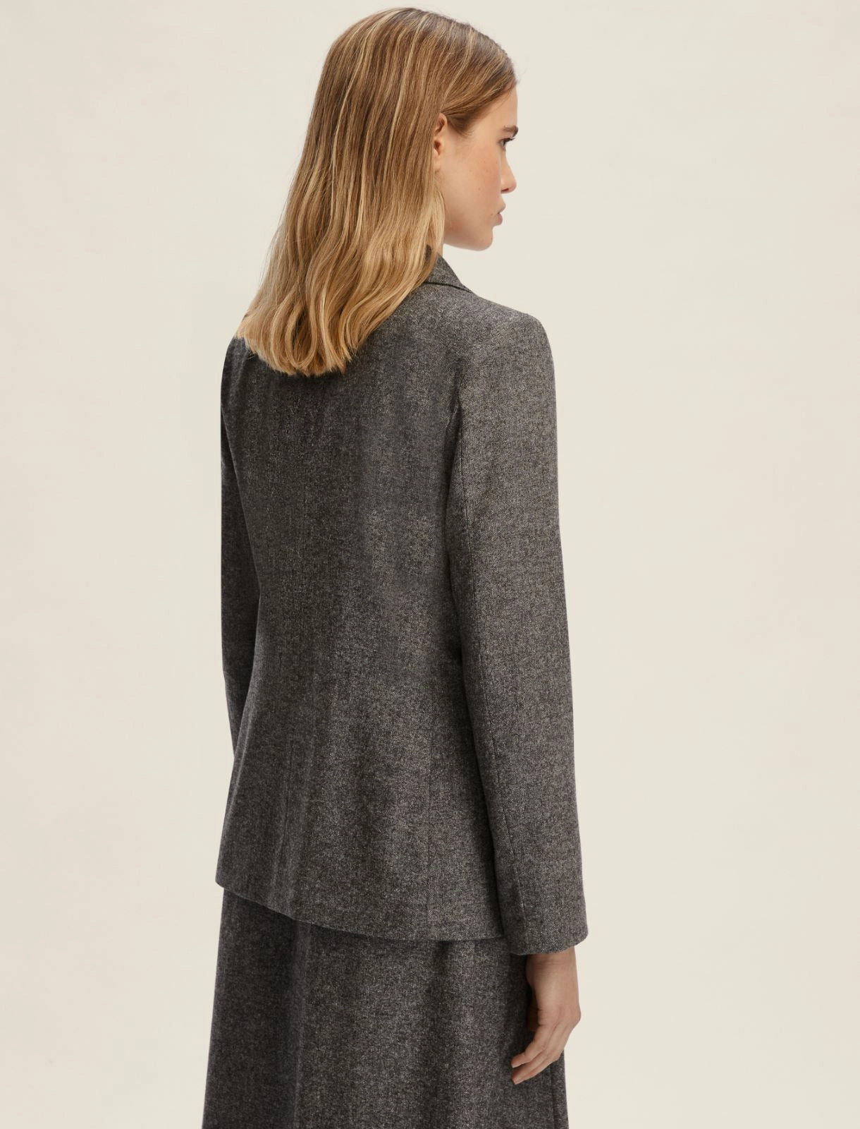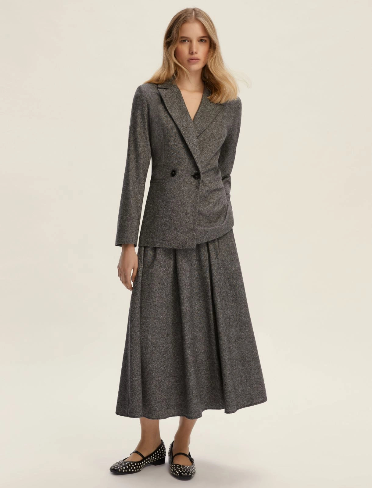 Scopri l'eccellenza della sartorialità italiana con questo nuovo blazer doppiopetto Emme Marella in flanella leggera misto lana con prestigiosa etichetta Manteco, che unisce sapientemente tradizione sartoriale e femminilità contemporanea.