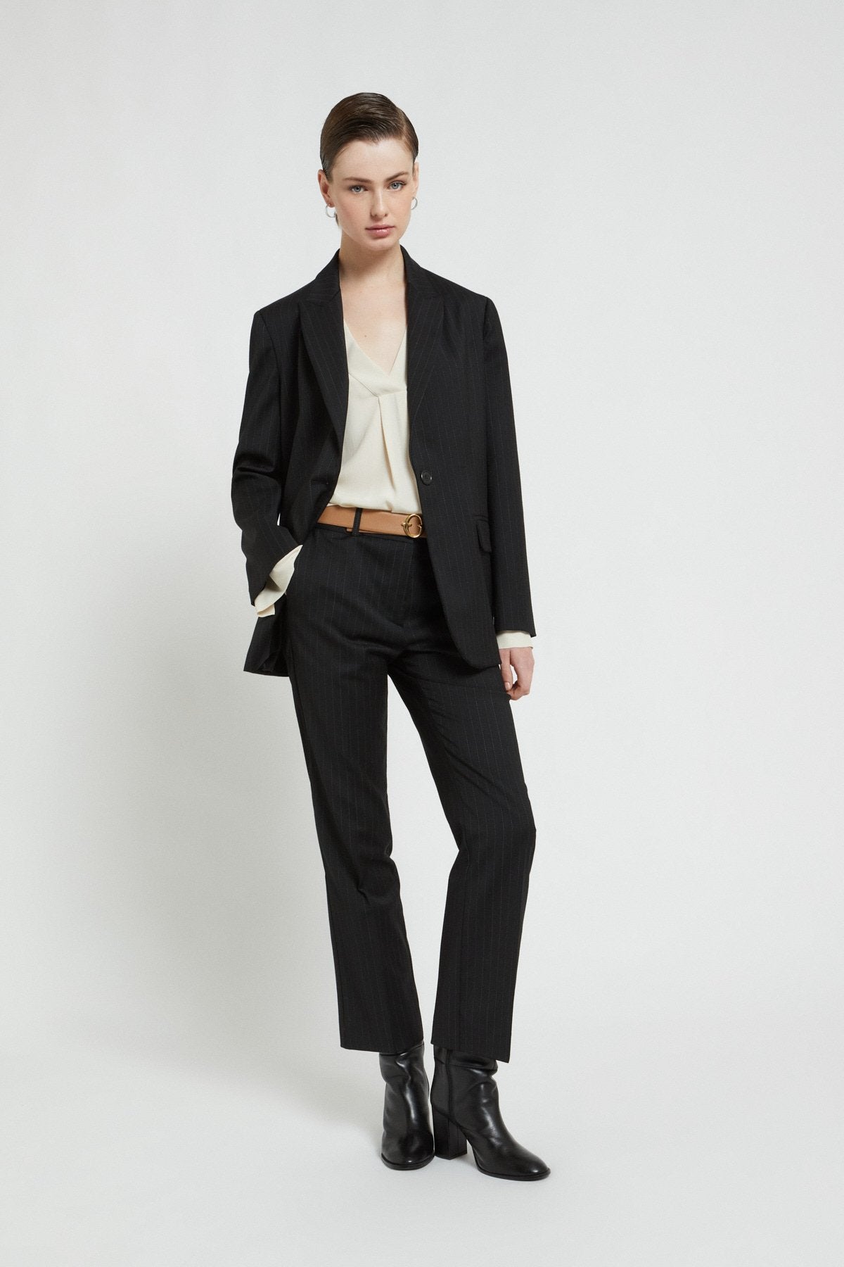 Questa giacca gessata a un bottone in fresco di lana combina eleganza e comfort. Il tessuto leggero e traspirante la rende ideale per le stagioni più calde, mentre il motivo gessato aggiunge un tocco distintivo e raffinato al tuo look formale o casual. Perfetta per chi cerca stile e praticità in un unico capo.