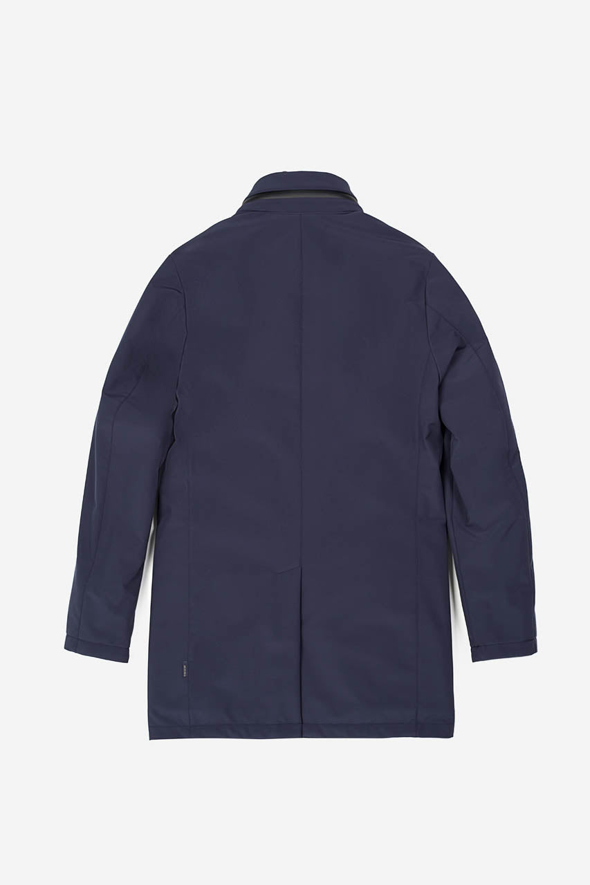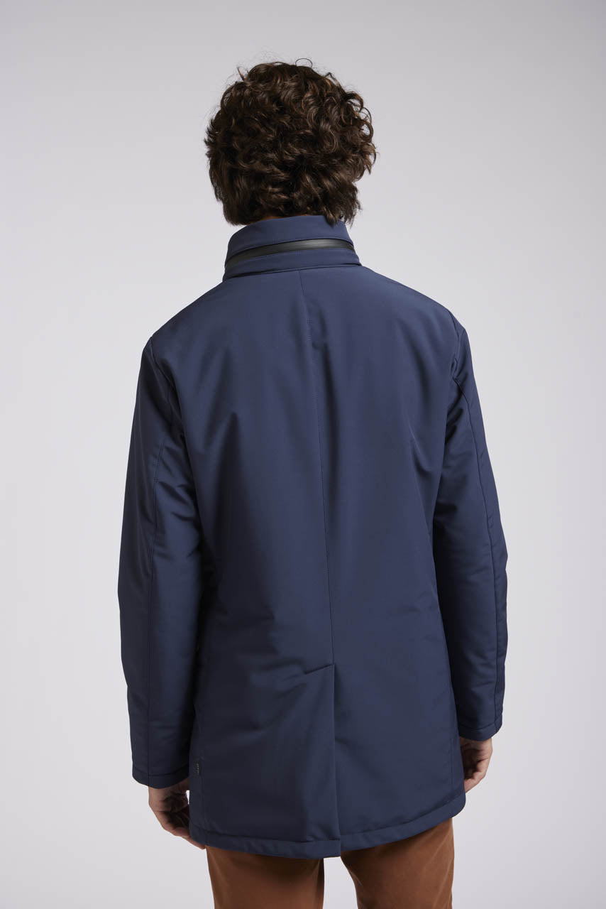 Giaccone con pettorina staccabile, chiusura nascosta, tasche frontali e spacco centrale sul retro.
