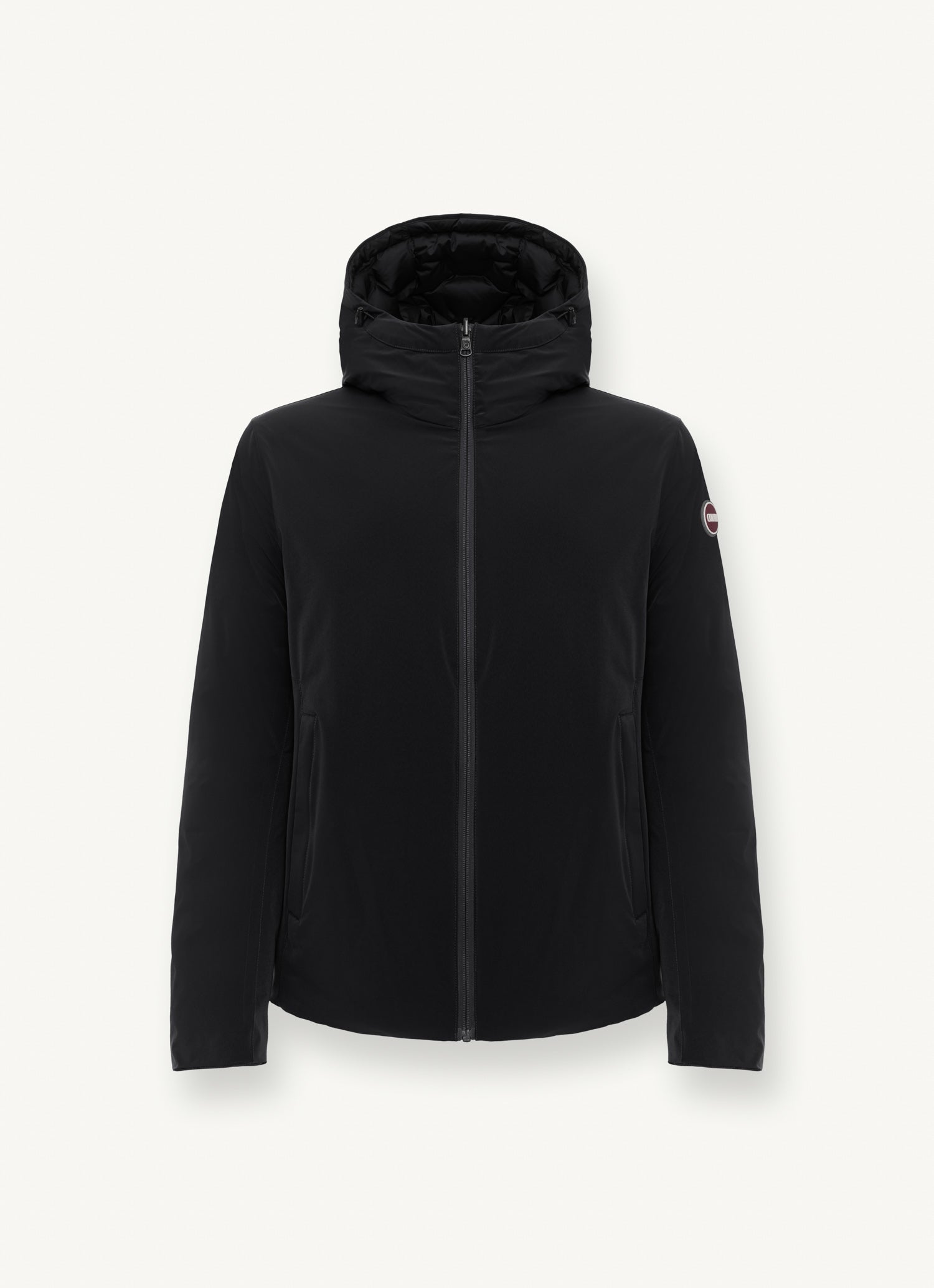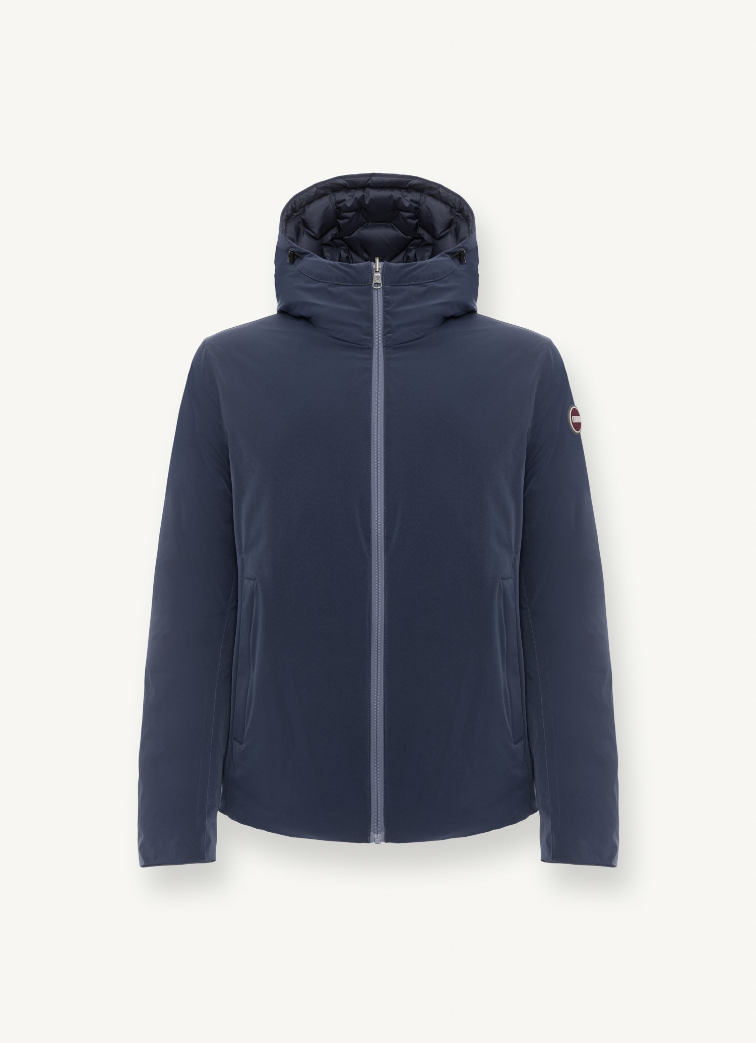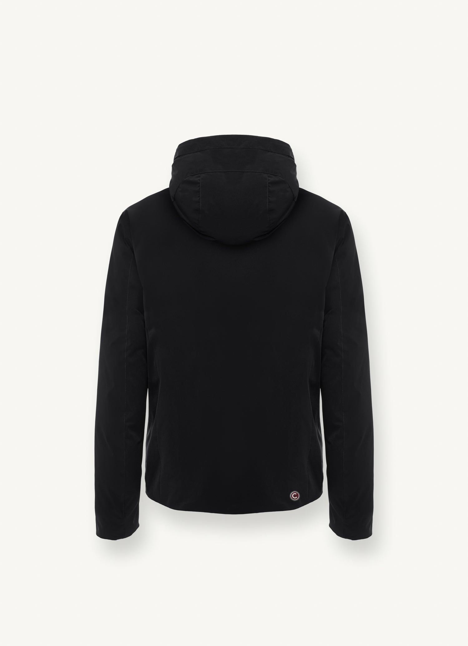 Piumino reversibile con cappuccio fisso realizzato all'esterno in tessuto stretch opaco con trattamento idrorepellente e impermeabile (5.000mm di colonna d'acqua), e, all'interno, da un tessuto con una costruzione particolare che non necessita di cuciture. Imbottitura in piuma naturale. Vestibilità regolare, chiuso con zip e tasche laterali con zip. Logo sulla manica sinistra e cappuccio fisso con coulisse.