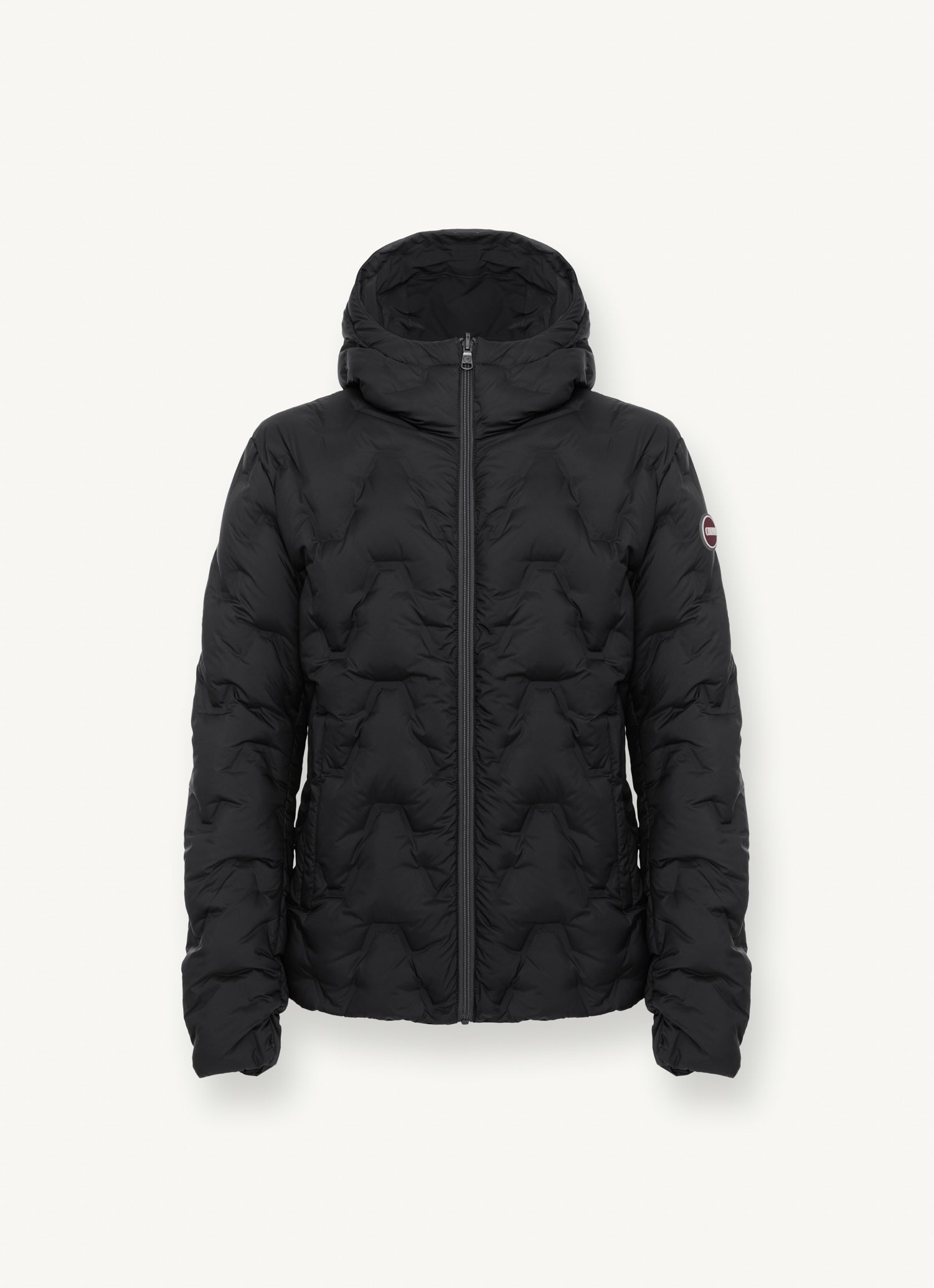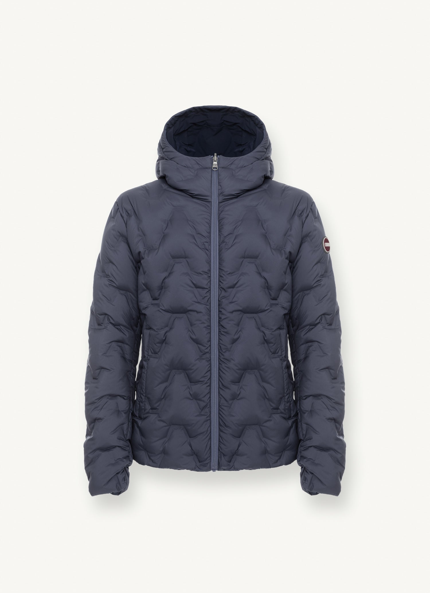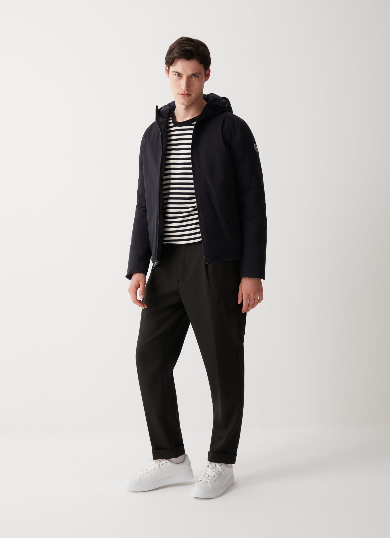 Piumino reversibile con cappuccio fisso realizzato all'esterno in tessuto stretch opaco con trattamento idrorepellente e impermeabile (5.000mm di colonna d'acqua), e, all'interno, da un tessuto con una costruzione particolare che non necessita di cuciture. Imbottitura in piuma naturale. Vestibilità regolare, chiuso con zip e tasche laterali con zip. Logo sulla manica sinistra e cappuccio fisso con coulisse.