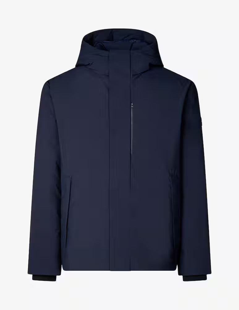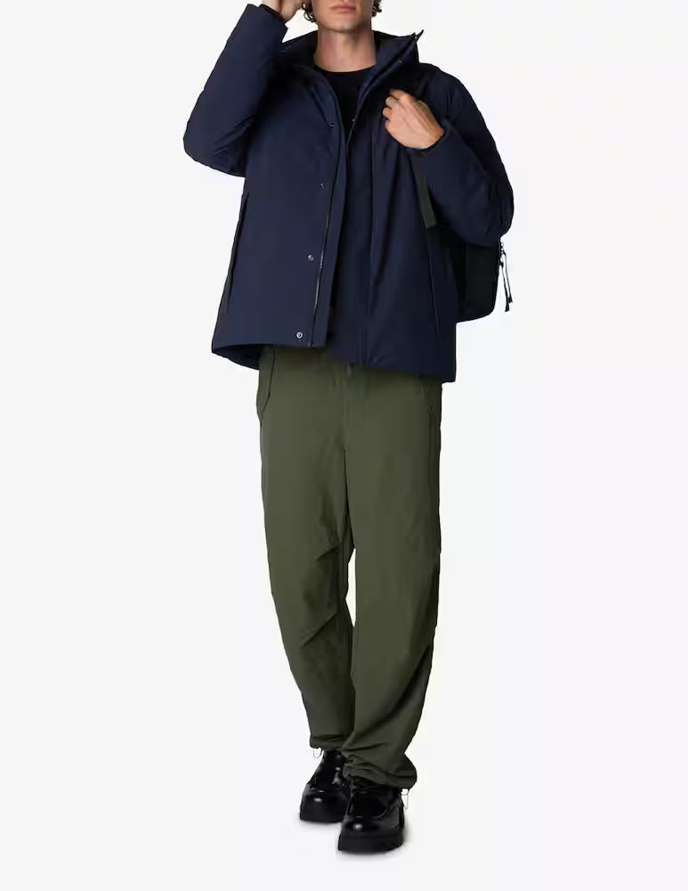 Tessuto esterno in 100% poliestere riciclato con membrana poliuretanica che garantisce performance tecniche eccellenti: impermeabilità 5000wp mm/24h e traspirabilità 5000 mvp g/m2/24h. L'imbottitura in PET riciclato da bottiglie di plastica e la fodera in 100% nylon riciclato completano un capo totalmente sostenibile.