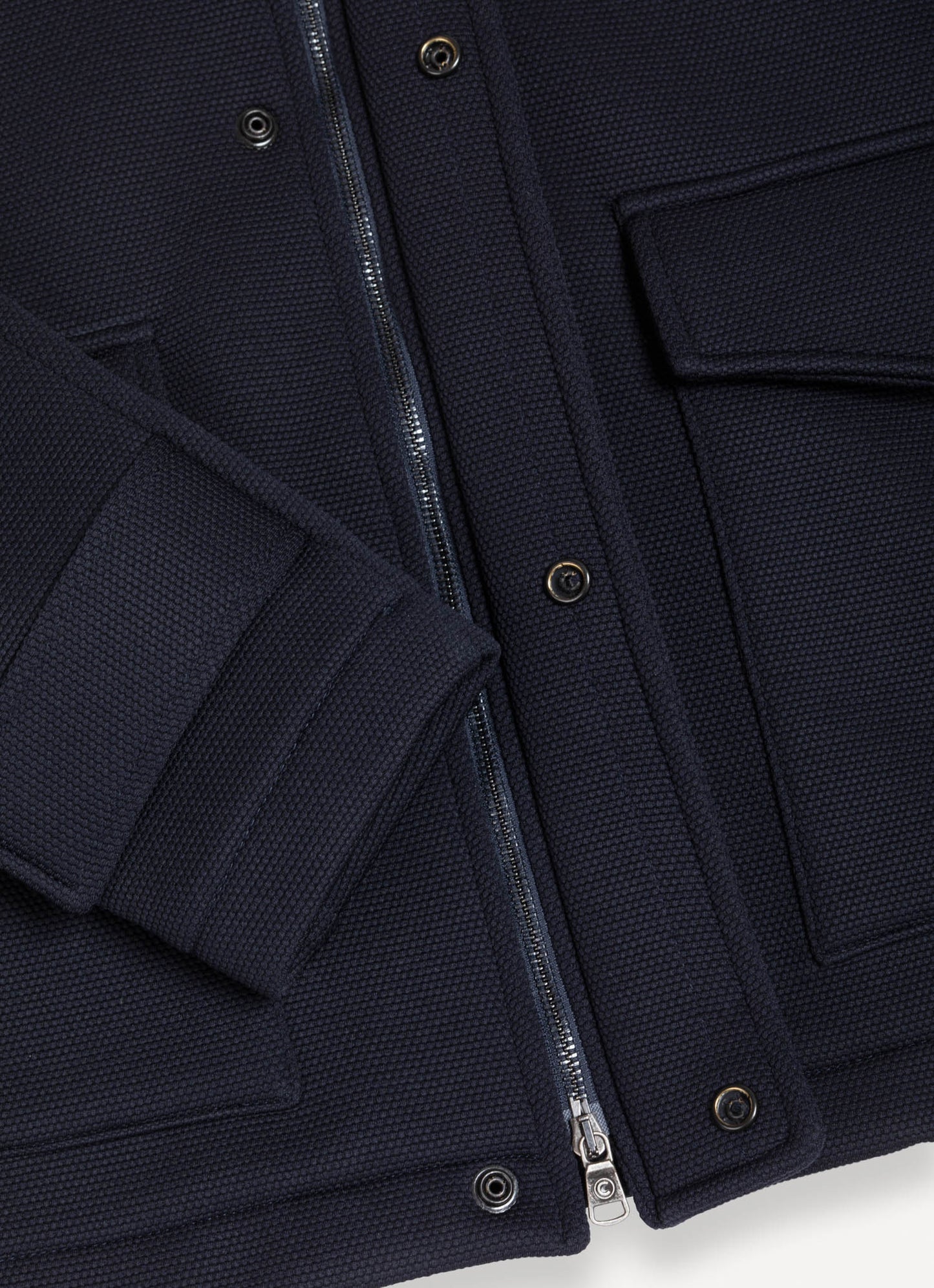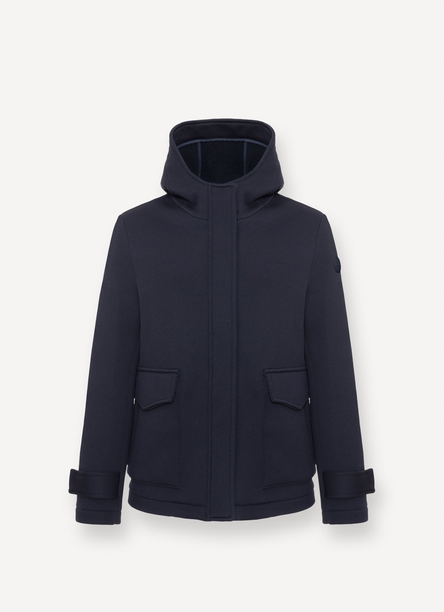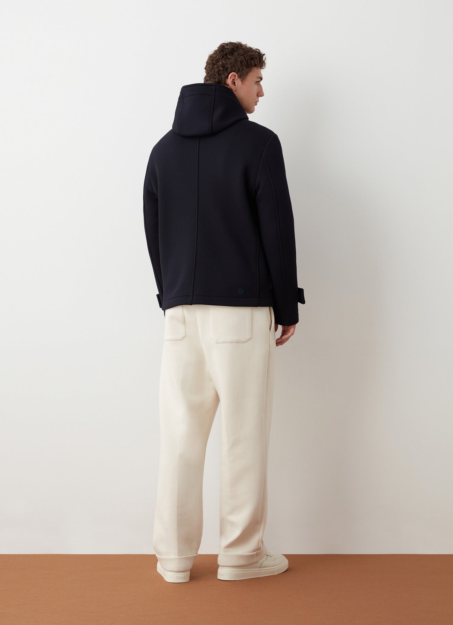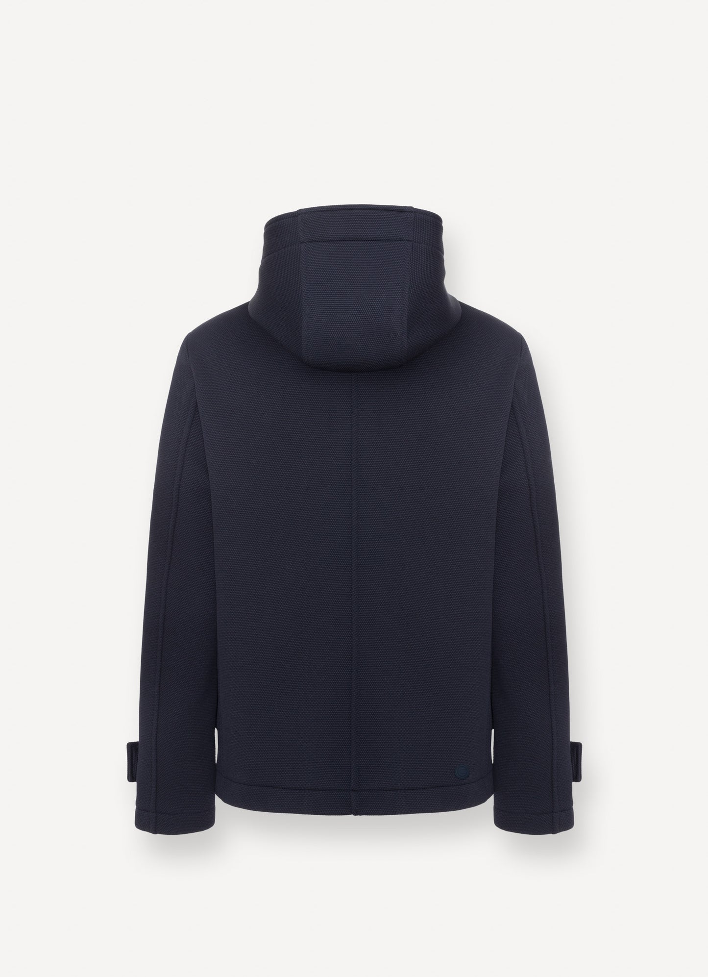 Giacca da uomo con cappuccio fisso realizzata in tessuto misto lana/nylon accoppiato al rovescio con un morbido panno di lana. Un modello versatile arricchito dalla particolare armatura del tessuto a nido d'ape che gli dà un look contemporaneo. Un capo raffinato dall'anima sportiva. Funzionale e confortevole si adatta ad outfit sportivi o eleganti. Ideale per le prime giornate autunnali.