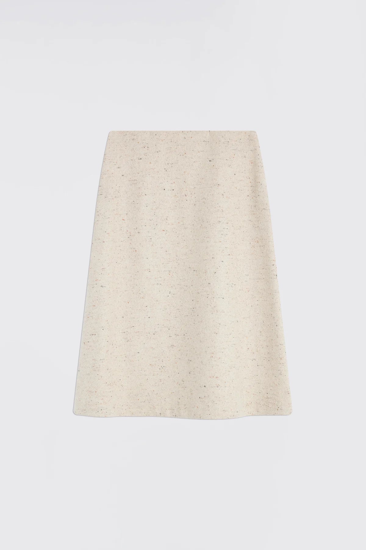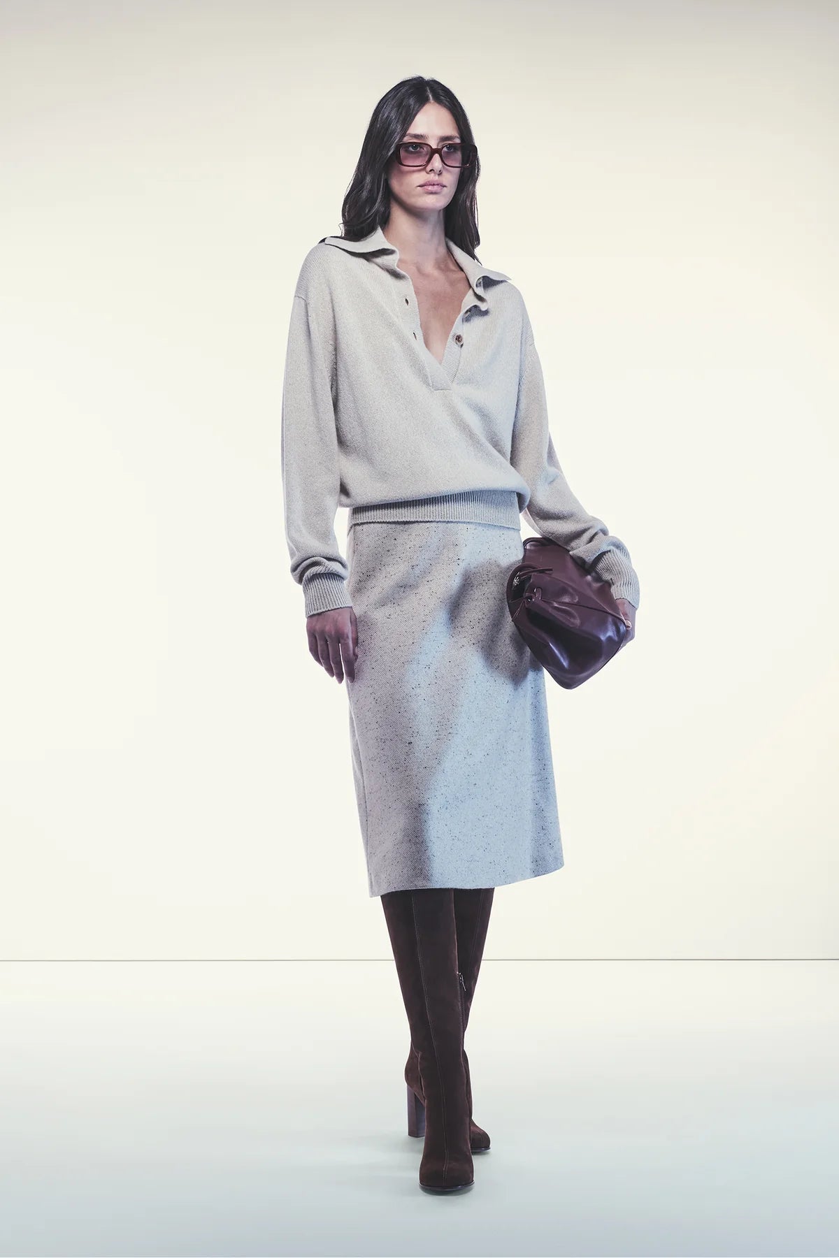 Gonna Meryl in misto cashmere con linea aderente e lunghezza al ginocchio o leggermente sotto. Il tessuto ha una superficie texturizzata con effetto bottonato che aggiunge un tocco raffinato. Chiusura con zip invisibile sul retro per un look pulito. Composizione di alta qualità: 74% cashmere, 23% poliammide, 3% lana, 67% acetato e 33% poliestere. Realizzata in Italia con vestibilità regular, è perfetta per un’eleganza sobria e confortevole.