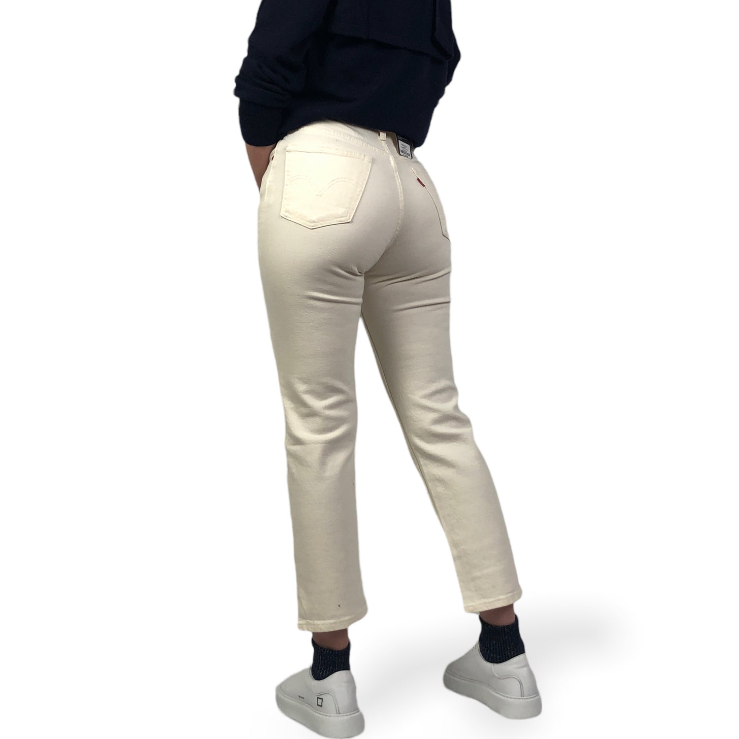 Cod.36200-0228 Jeans a vita alta, lunghezza alla caviglia, vestibilità 501, apertura con zip frontale e bottone in cintura.