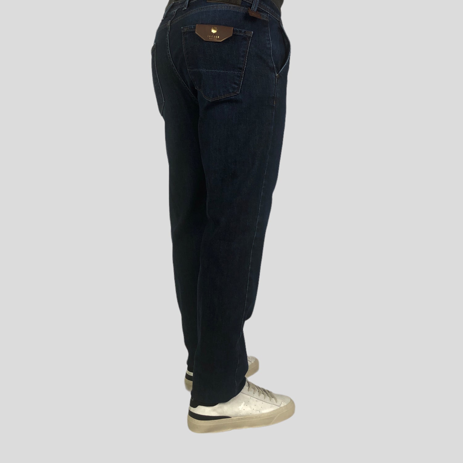 Cod.T9049-222016-DM Jeans in denim stretch con tasche a filo sui fianchi e a toppa posteriormente. Chiuso con zip e bottone, passanti in vita. Made in Italy