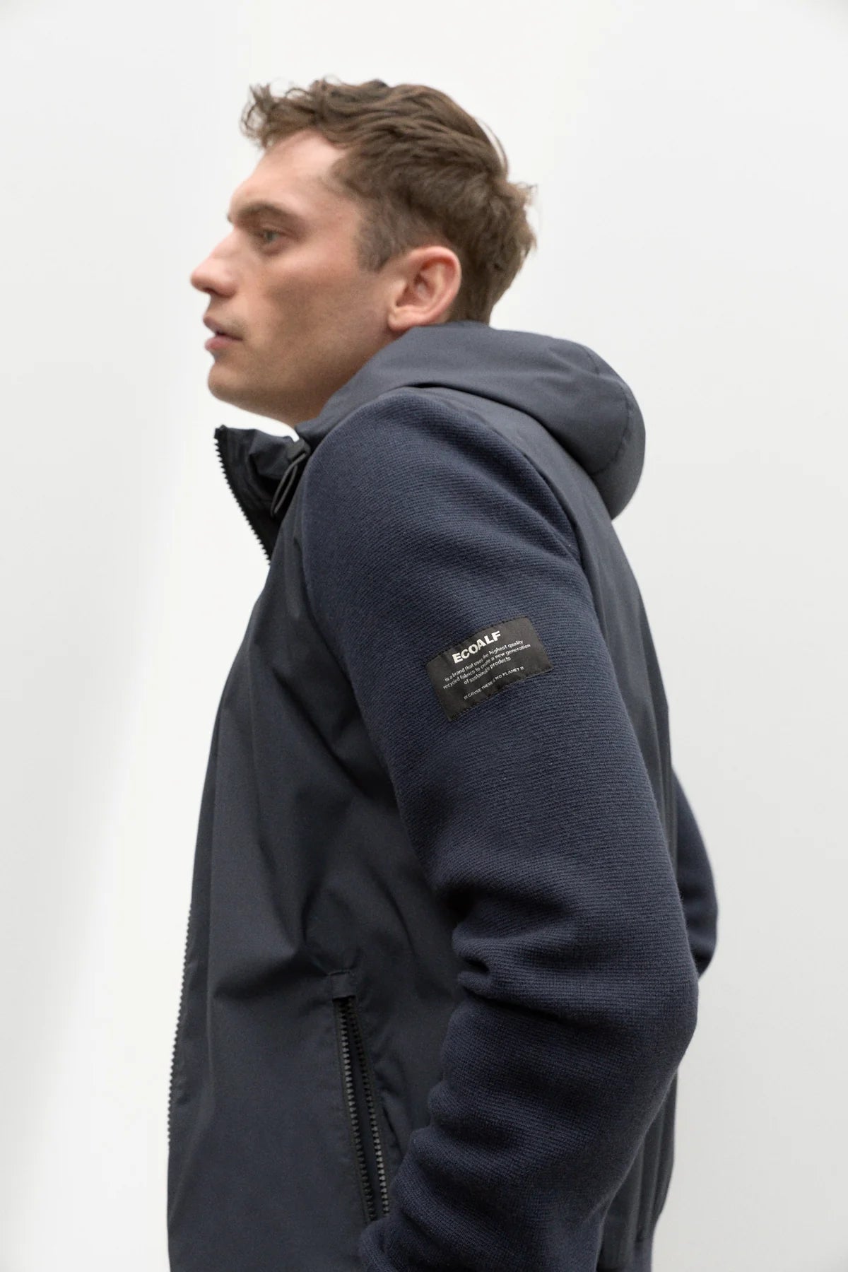 Cod.LILO Giacca in maglia di poliestere riciclato ottenuto dalle bottiglie di plastica. Contiene anche viscosa ottenuta dagli scarti della lavorazione del legno. Chiusa con zip, cappuccio fisso con coulisse regolabili e logo sulla manica sinistra.