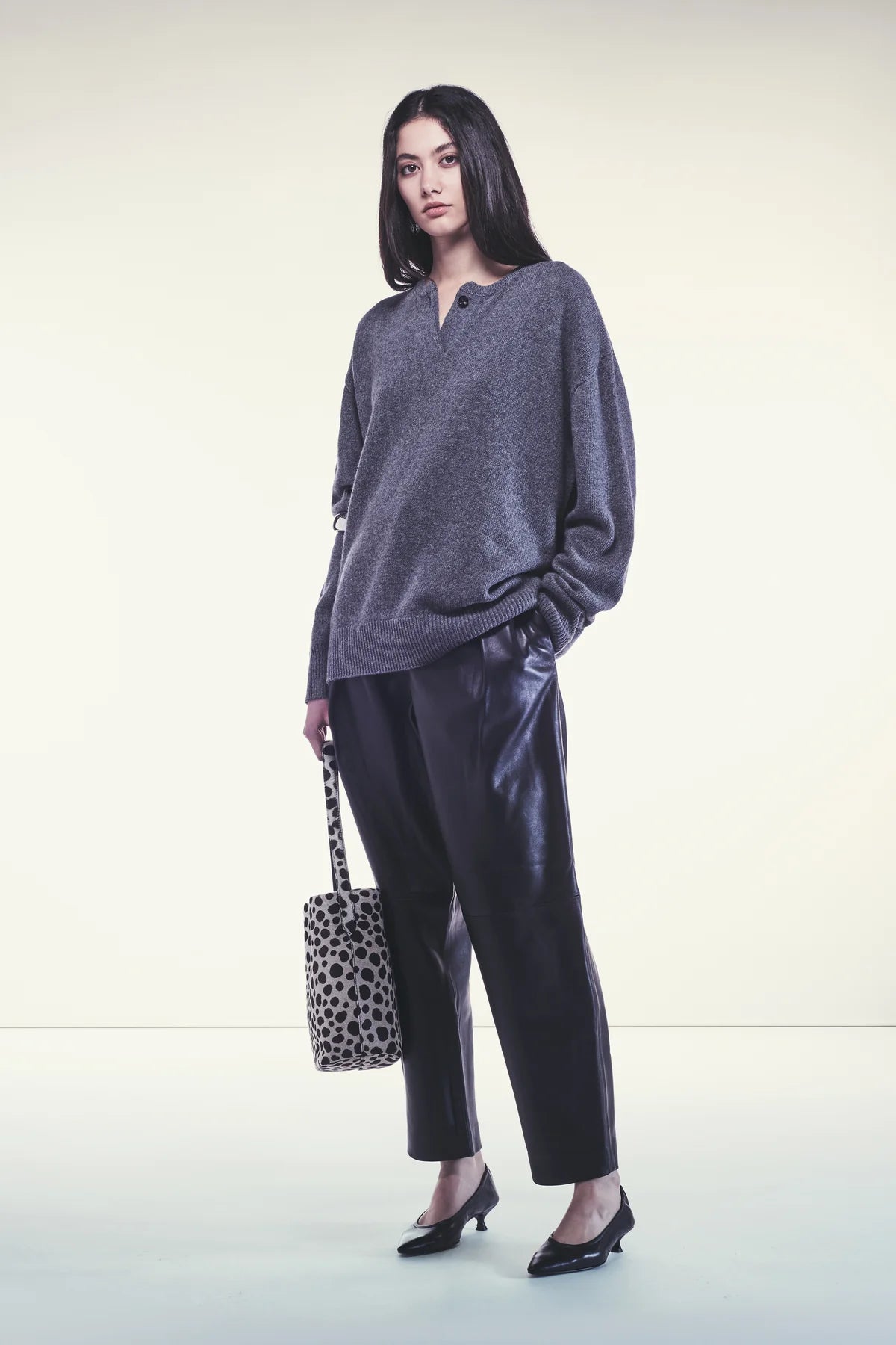 Maglia Charles è una raffinata maglia oversize realizzata in cashmere riciclato e poliamide, per un comfort sostenibile e duraturo. Presenta uno scollo classico leggermente a V con abbottonatura parziale a un bottone, che aggiunge un tocco di eleganza discreta. Polsini e fondo doppi elasticizzati garantiscono vestibilità comoda e una perfetta tenuta della forma. Prodotta in Italia, unisce qualità artigianale e stile contemporaneo in un capo versatile e confortevole.