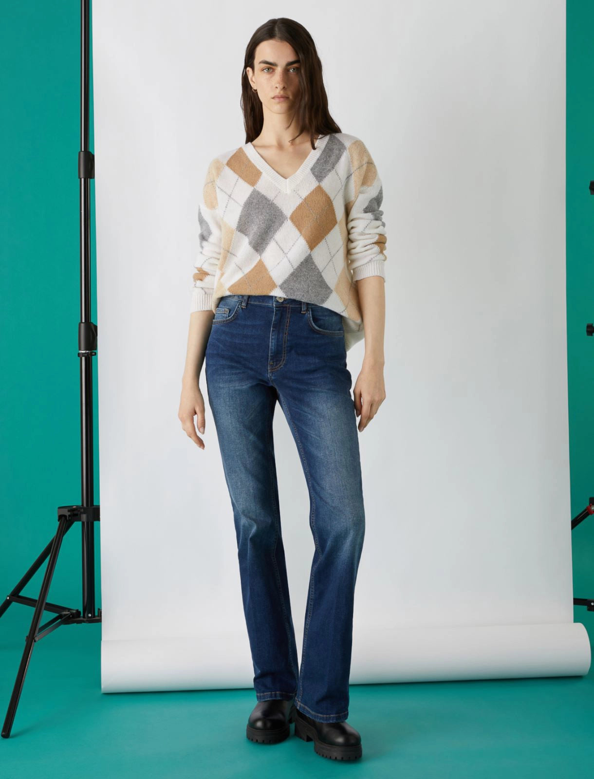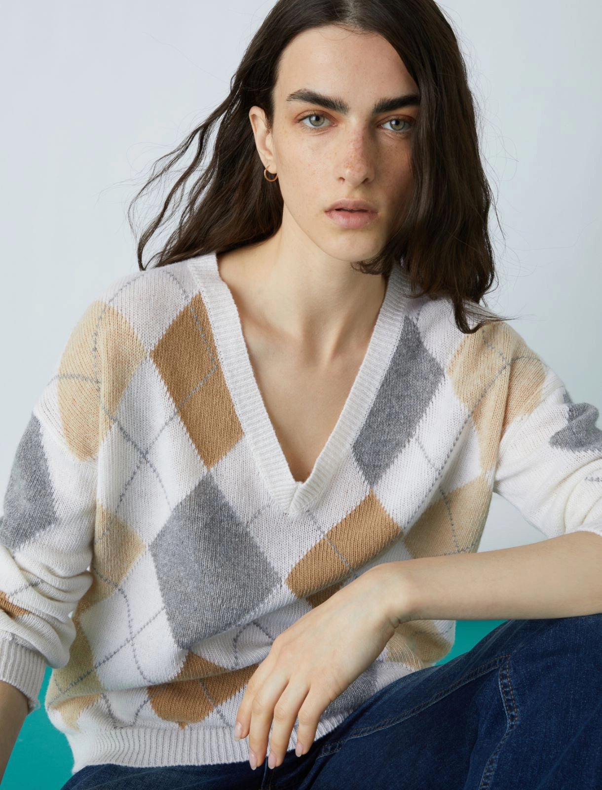 Cod.MARZO Maglia in lana merinos a losanghe scollata a V con bastonetto al fondo, nello scollo e nelle maniche. Spalle scese