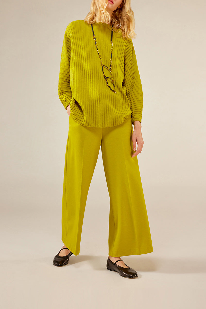 Maglia ampia a coste, manica a kimono lunga, girocollo ampio, orlo dritto. Vestibilità over