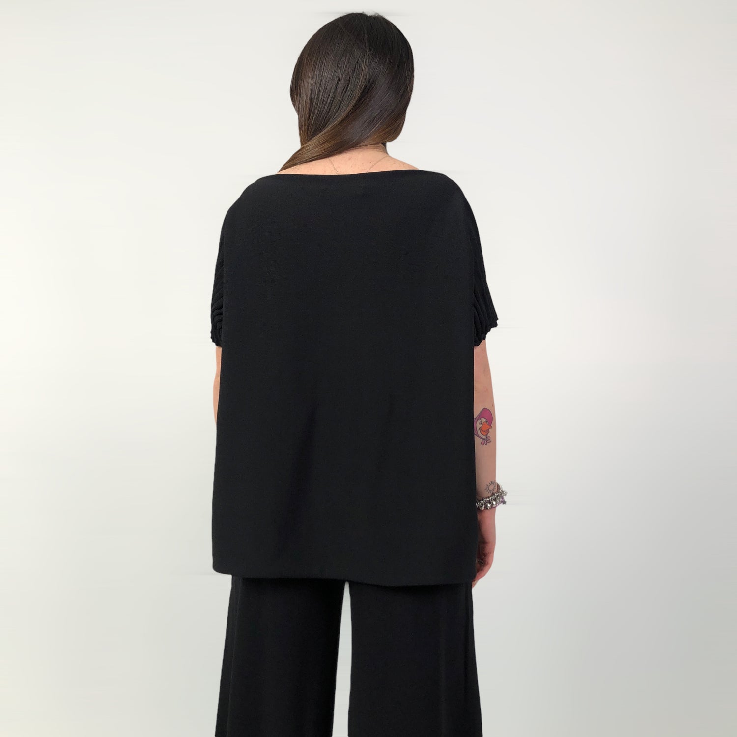 Cod.L2S006 Maglia in viscosa stretch con ampio scollo a barchetta e maniche corte. Sul seno dettaglio con pieghe che si ripropone anche sulle maniche. Modello a scatola lunghezza ai fianchi.