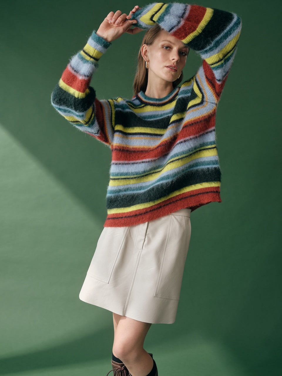 Indossala con jeans bianchi e sneakers per un weekend casual vivace, oppure abbinala a gonna plissé e ballerine per un look femminile e colorato. Per l'ufficio casual, valorizzala con pantaloni chino e blazer neutro, lasciando che le righe colorate aggiungano personalità al tuo outfit.