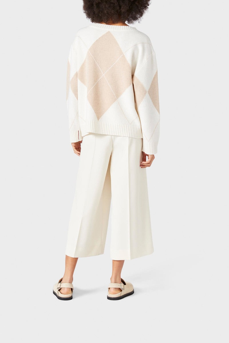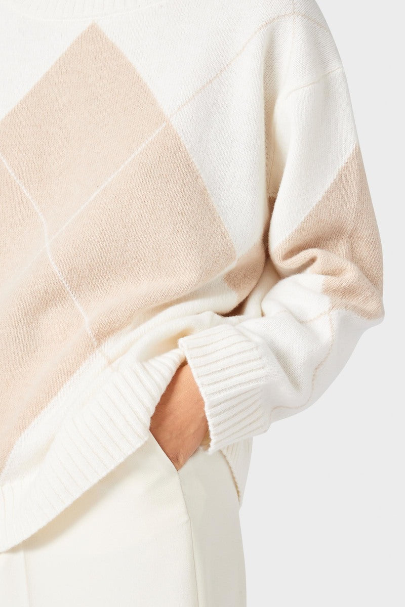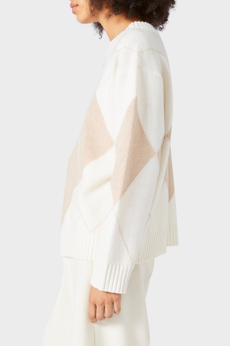 Cod.F2WB80 Maglia in lambswool fantasia rombi, girocollo, maniche lunghe, modello leggermente over, collo, polsini e fondo bordati a coste, lunghezza ai fianchi.