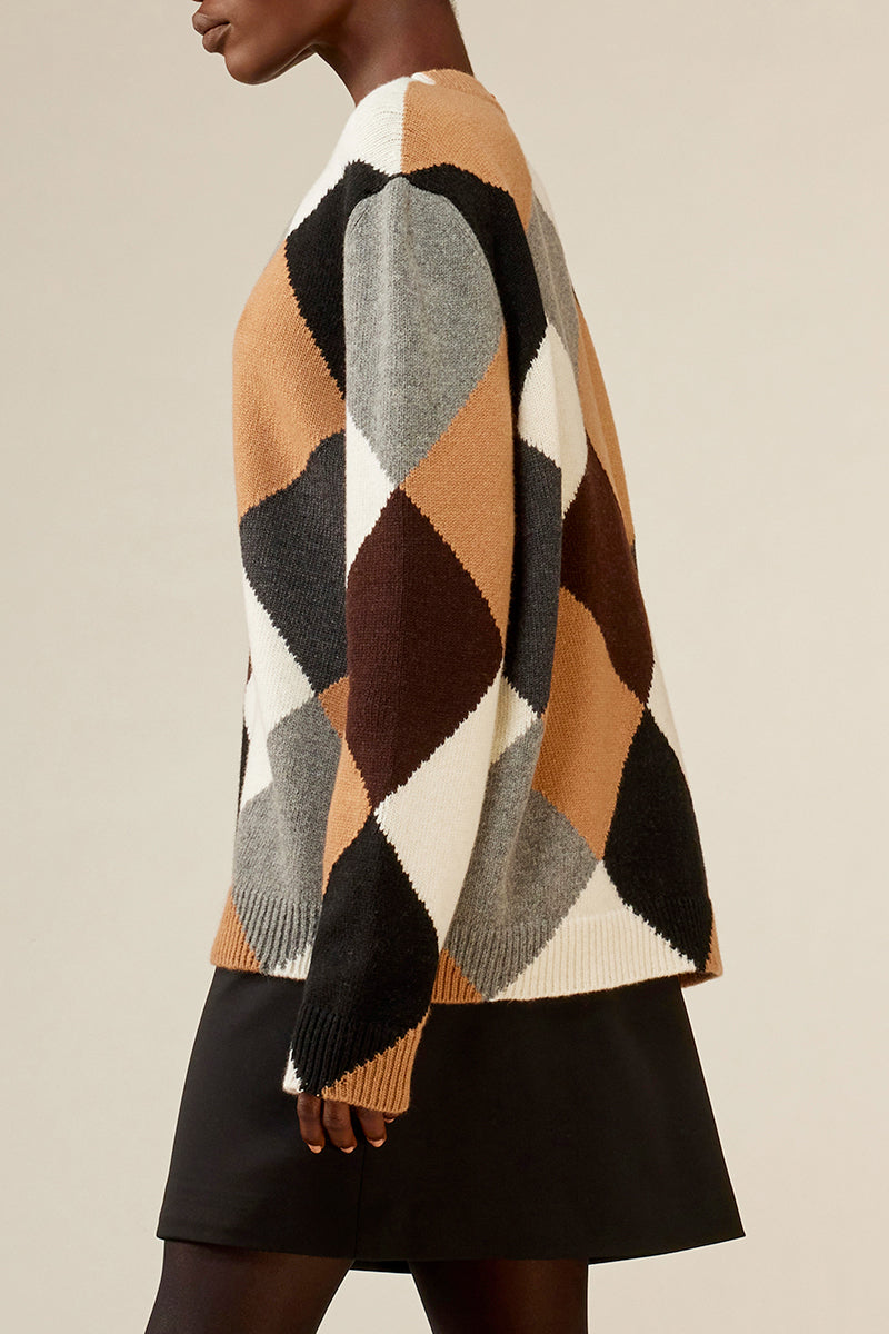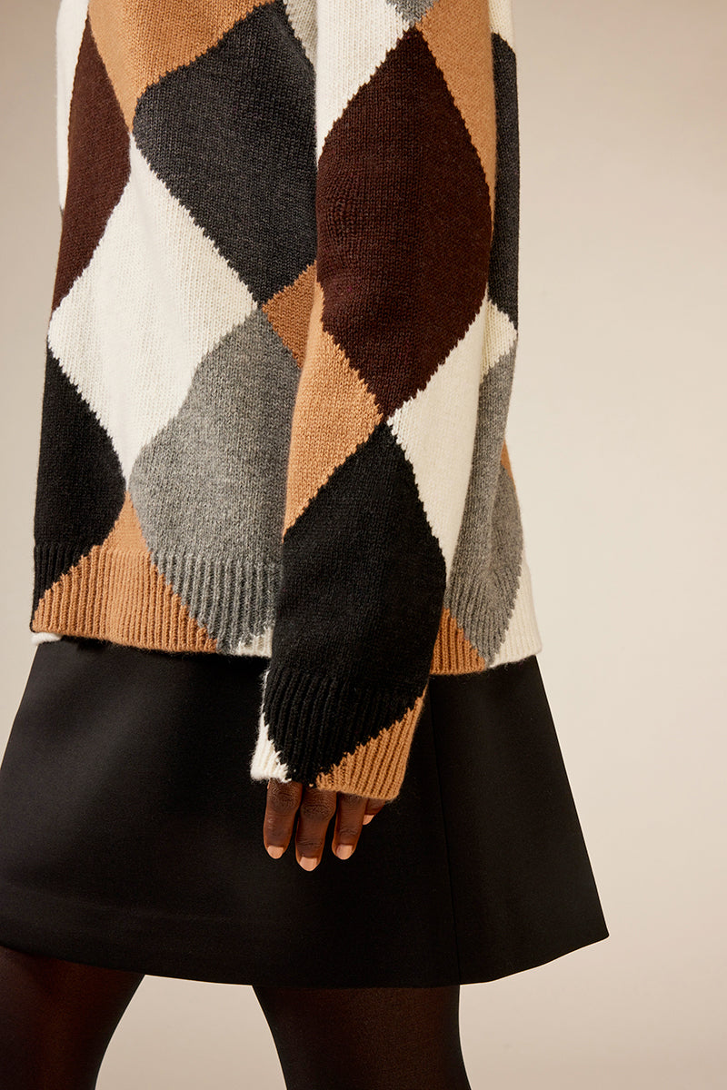 Maglia a rombi multicolor in cashmere riciclato e lambswool, girocollo, spalla scesa e manica lunga, vestibilità confort con bordi rifiniti a coste. Vestibilità over