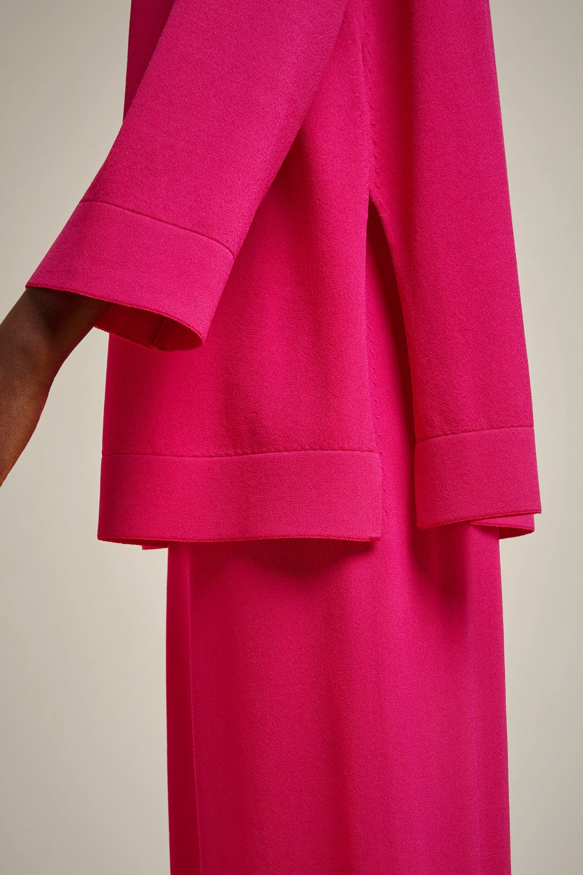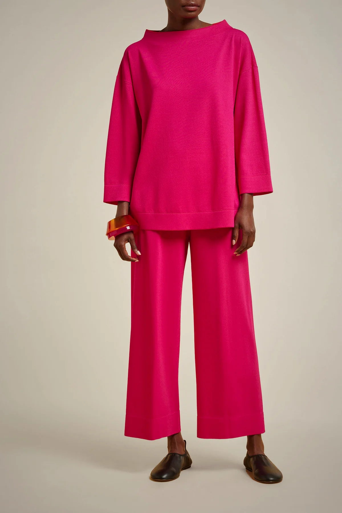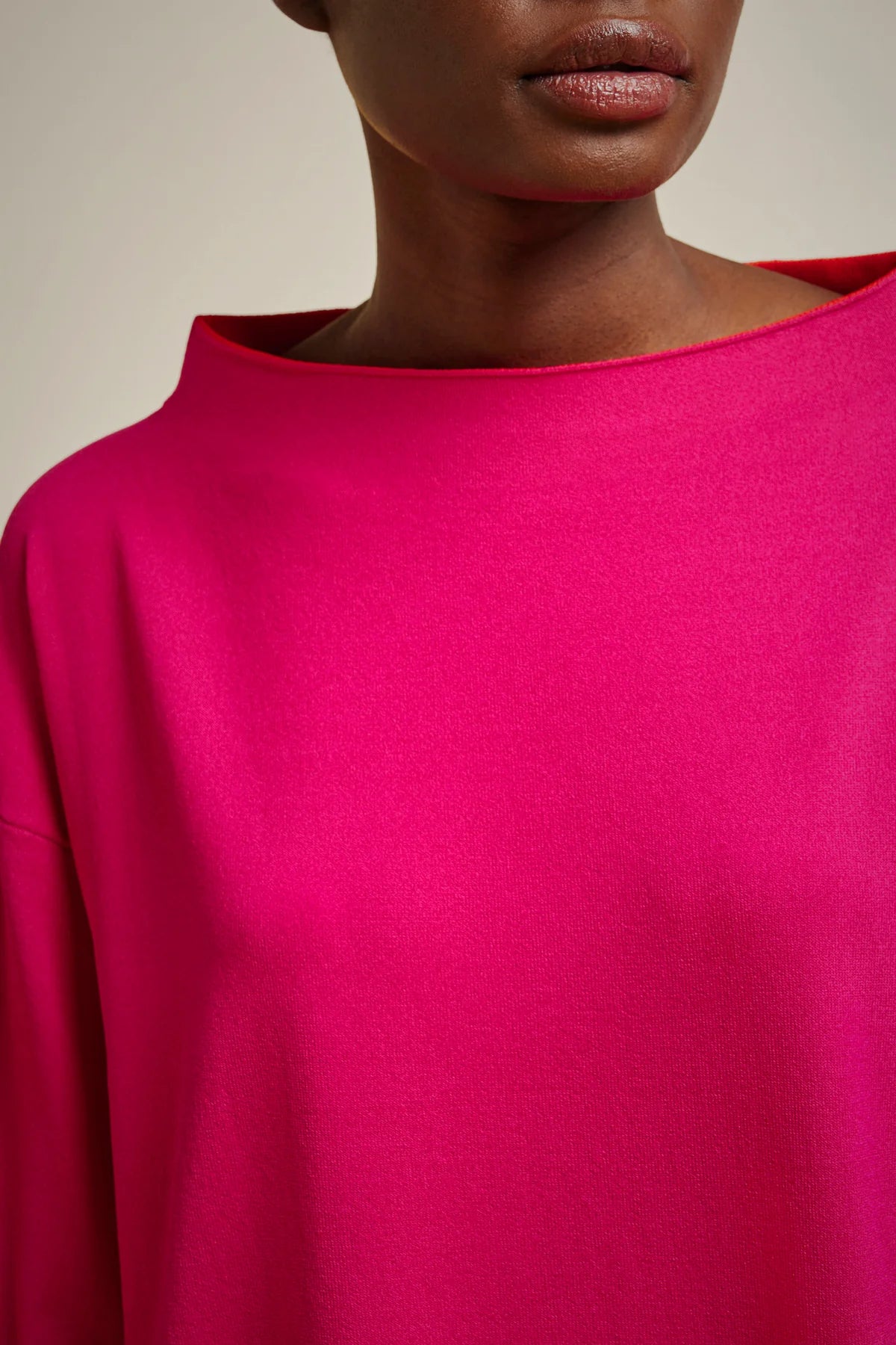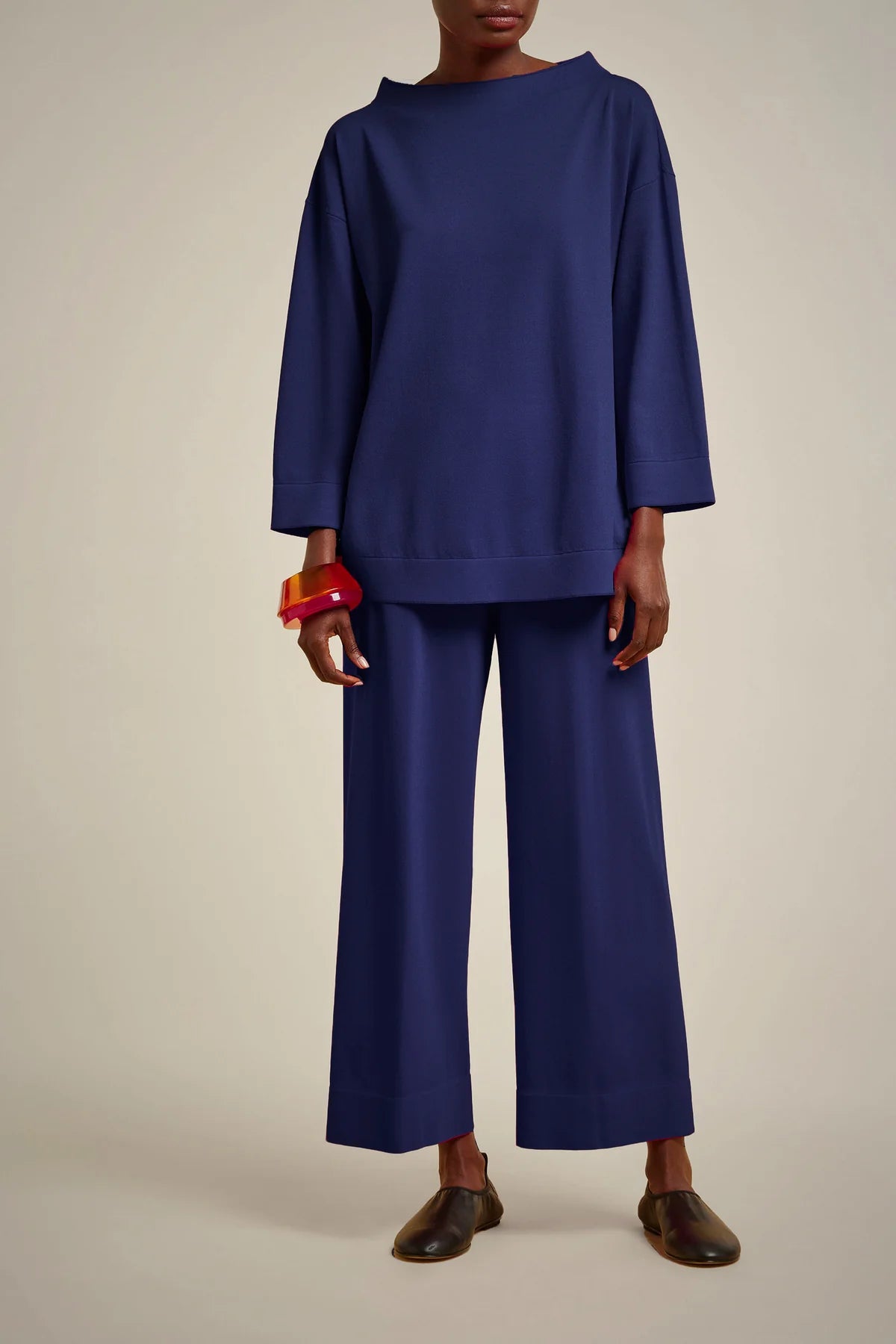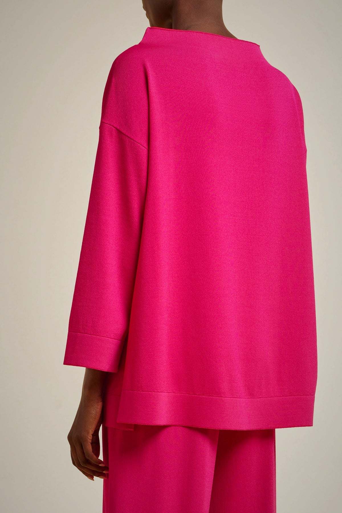Maglia in viscosa stretch con bordi double, a girocollo alto, maniche a tre quarti, modello svasato al fondo e lunghezza sotto ai fianchi