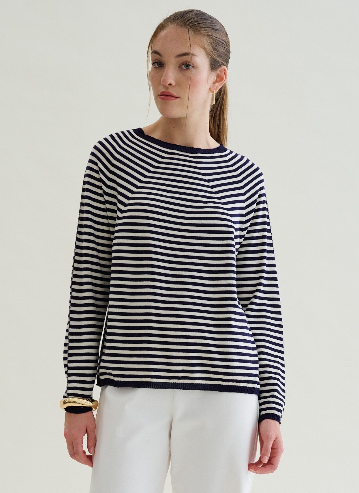 Si abbina a pantaloni bianchi o beige per un look marinaro classico e impeccabile — come in foto — o a jeans e gonna per un outfit quotidiano curato. La colorazione Paprika-cipria offre un'alternativa più calda e romantica, perfetta con toni neutri e terrosi.