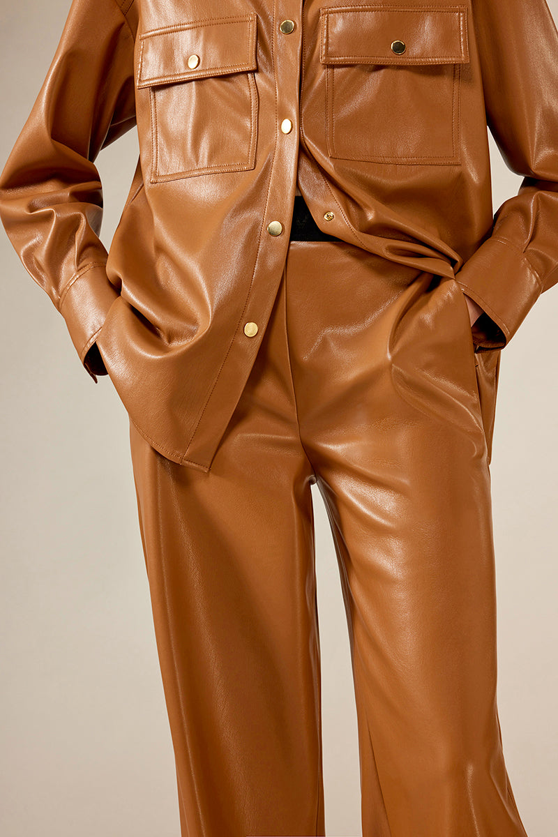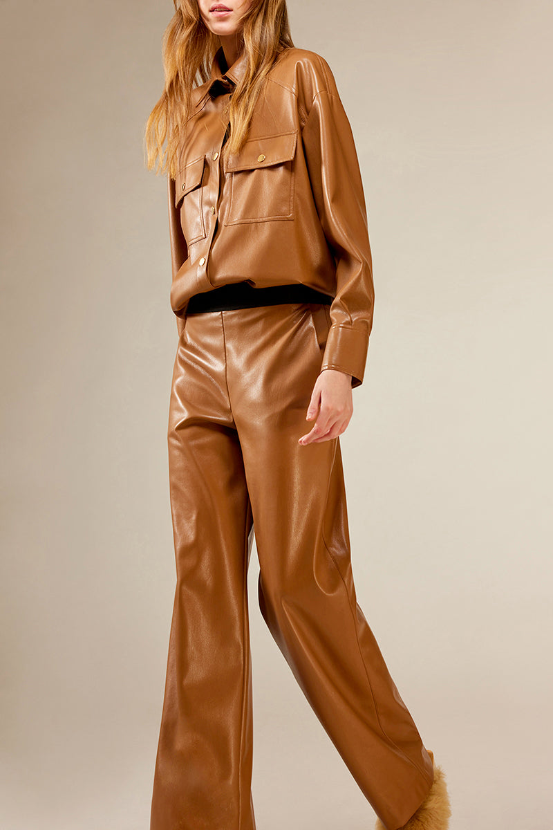 Pantalone palazzo in ecopelle, elastico logato in vita. Vestibilità regular