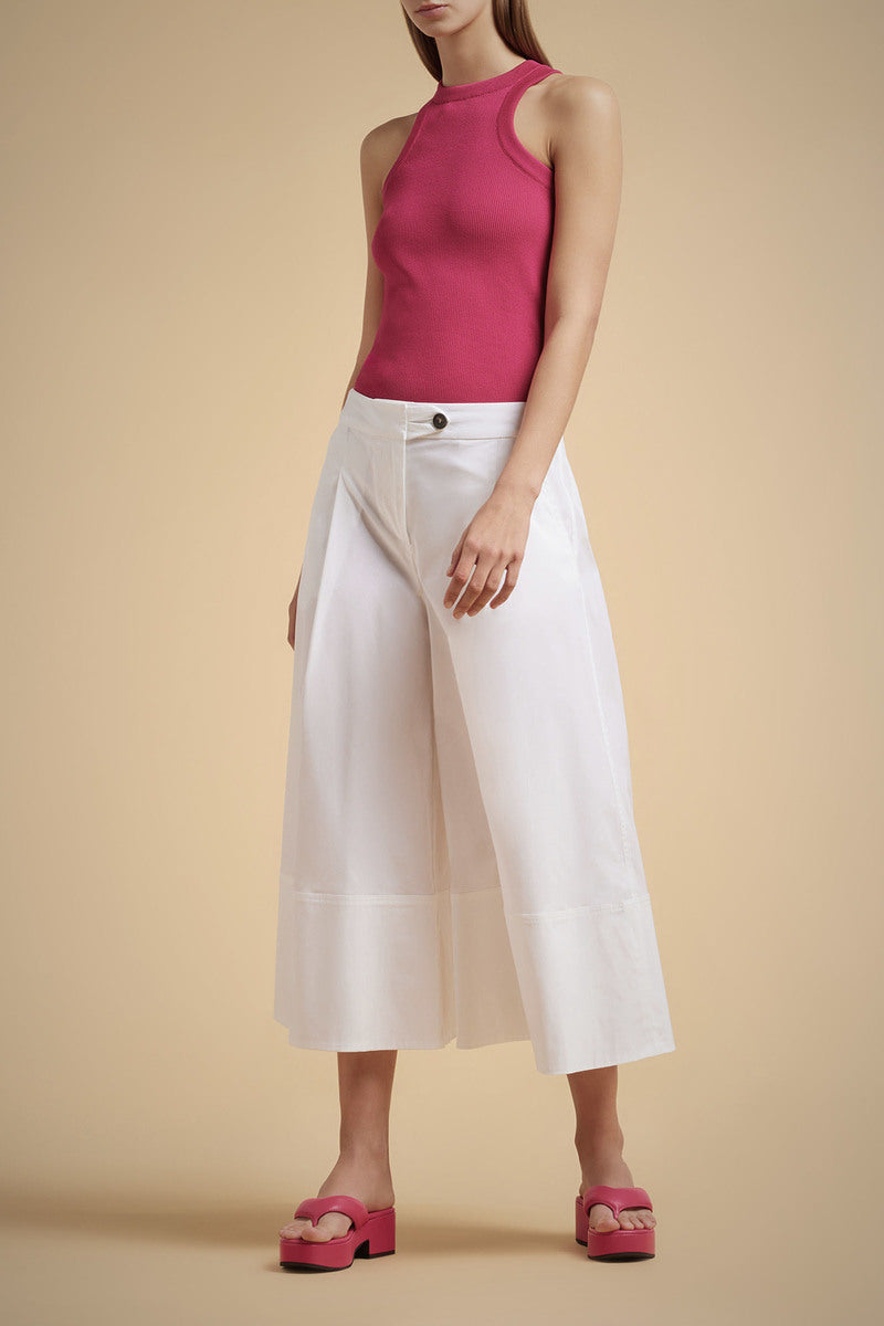 Cod.F3SK82 Pantaloni modello gaucho in tela di cotone. Fascione in vita con alamari in vita, chiusura asole e bottone. Bordo alto al fondo, tasche lungo i fianchi davanti e tasche a filetto sul dietro.