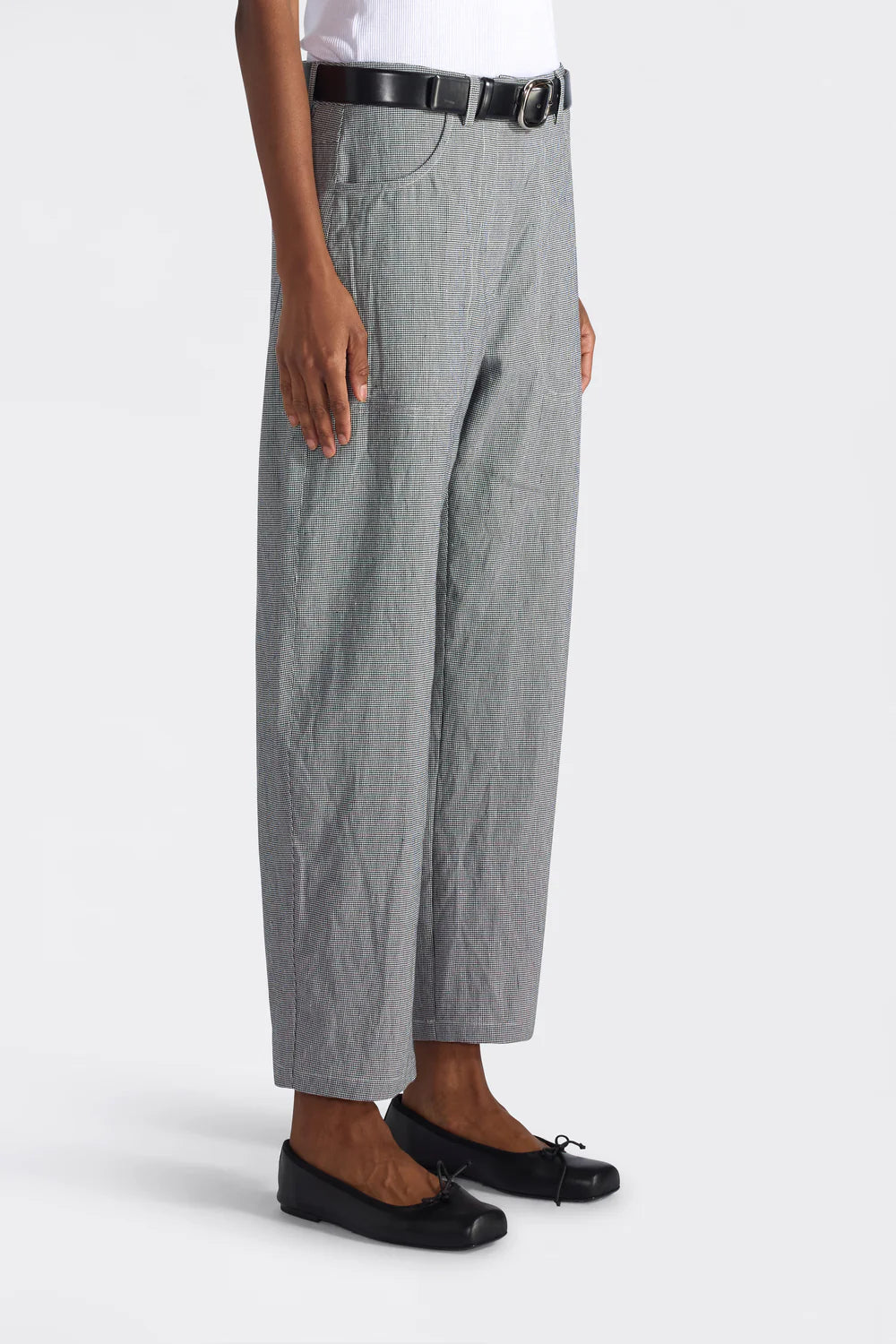 Un pantalone che celebra il taglio balloon attraverso il micro pied de poule in misto lino che cattura lo sguardo. Realizzati con chiusura centrale e tasche applicate dai bordi arrotondati, questi pantaloni crop rappresentano l'equilibrio perfetto tra volume contemporaneo e dettagli raffinati, perfetti per chi cerca capi che esprimono personalità attraverso silhouette distintive e manifattura italiana d'eccellenza.