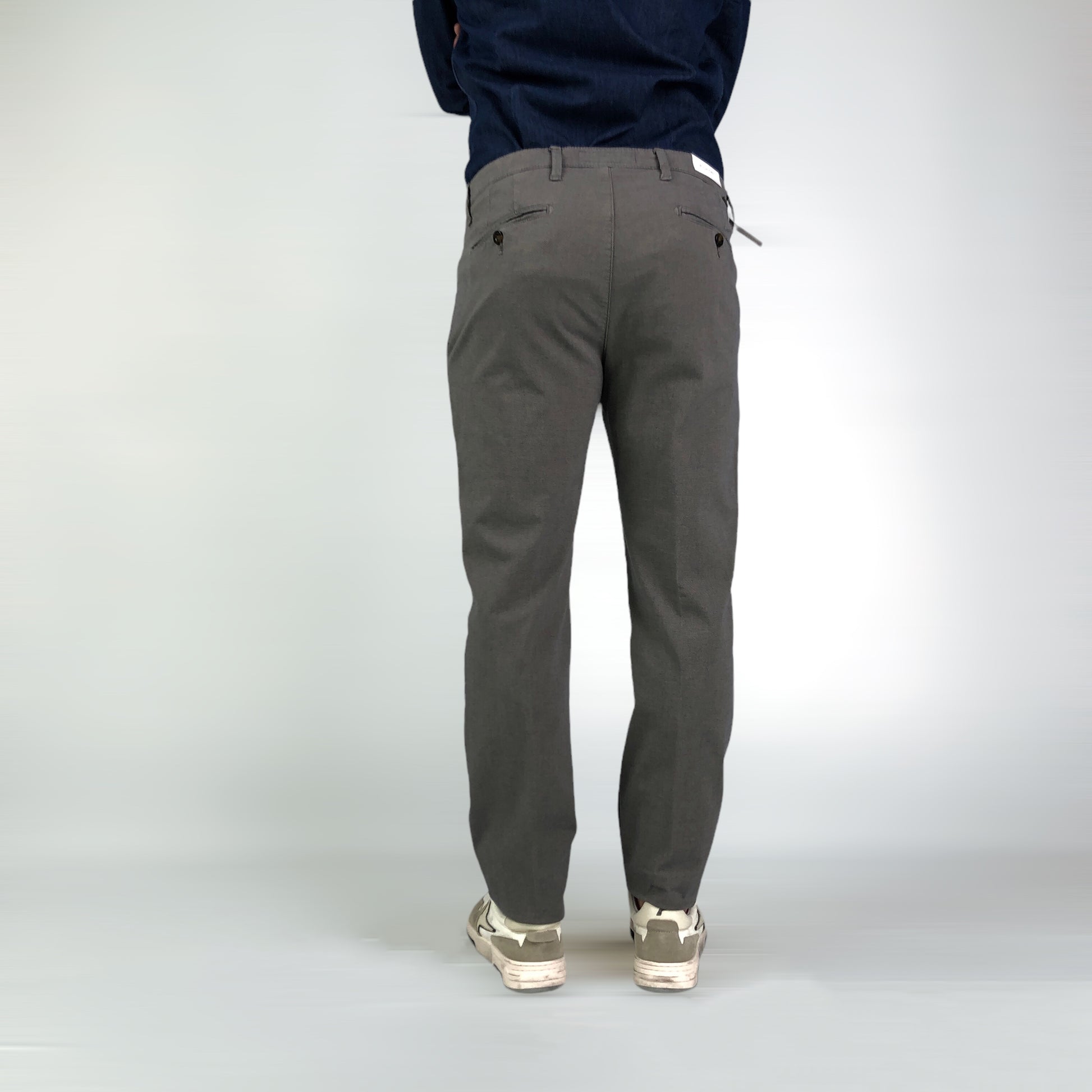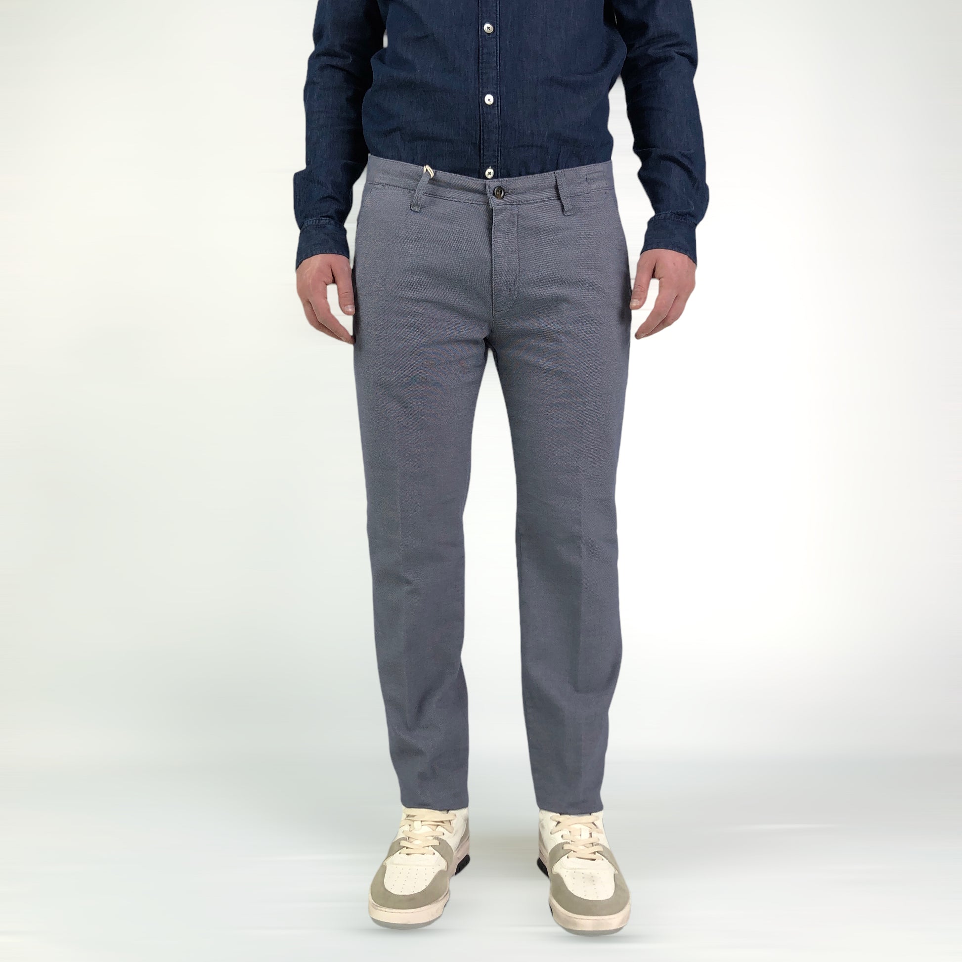 Cod.T910-122190 Pantaloni in cotone in tessuto occhio di pernice, una particolare lavorazione che intreccia fili chiari e scuri conferendo al capo un effetto ottico in cui spicca il bianco sullo scuro. Modello con tasche a filo sui fianchi, chiusura con zip frontale e passanti in cintura, tasche posteriori a filetto chiuse con bottone.