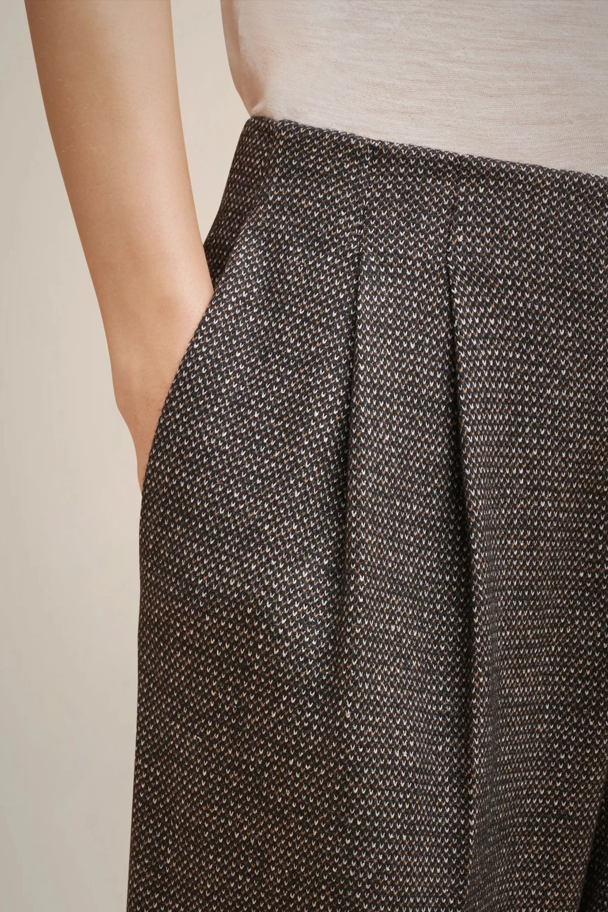 Realizza un look elegante e sofisticato con i nostri pantaloni pepe sale. Realizzati in pregiato panno di cashmere, con una gamba ampia e affusolata al fondo, questi pantaloni presentano pieghe alla vita fisse e tasche alla francese per un tocco di stile. Le pinces posteriori garantiscono una vestibilità perfetta.