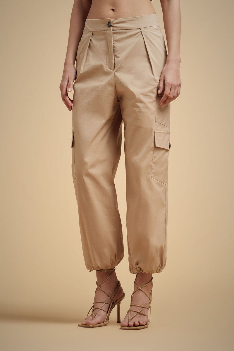 Cod.F3SK83 Pantaloni modello cargo in tela di cotone con tasche e patte. Chiusura frontale con zip e bottone. Fondo con coulisse regolabile e tasche a filo sui fianchi.