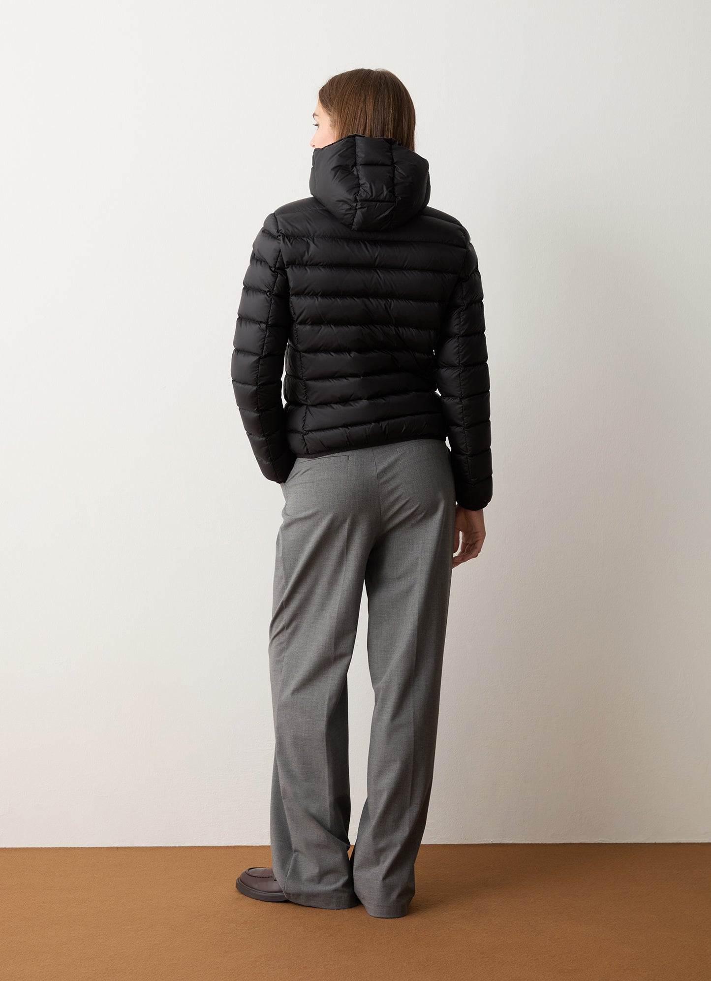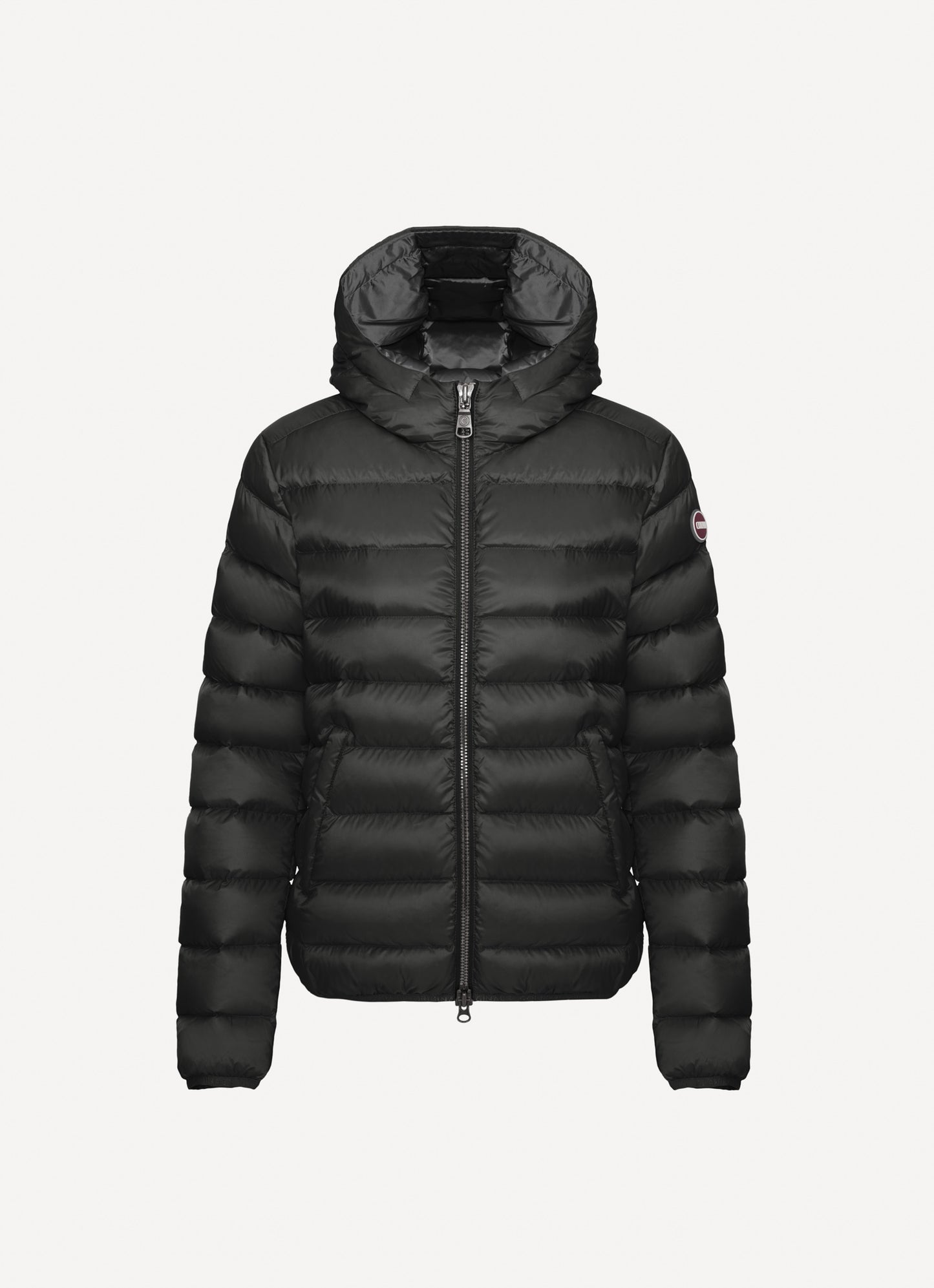 Piumino da donna con cappuccio fisso realizzato in tessuto cangiante 100% riciclato e trattamento idrorepellente. Imbottito in piuma naturale con trapunti regolari. Fodera a contrasto, tessuto femminile e leggera modellatura dei fianchi.
