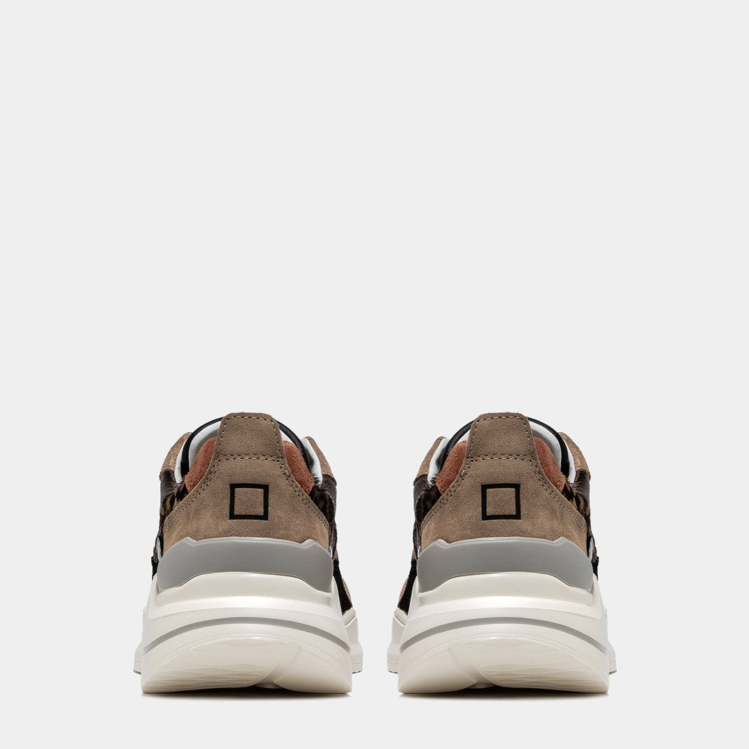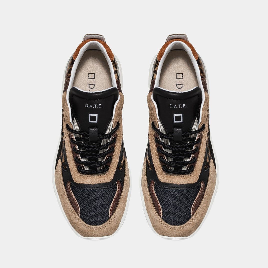 Cod.W371-FG-PN-EE Sneaker modello running in tessuto tecnico, camoscio e pelle colore nero con inserti in cavallino animalier. Dettagli in camoscio colore taupe e pelle laminata colore bronzo. Il patch in pelle colore nero con logo e scritta D.A.T.E. impressi, è cucito sulla linguetta. Il nome FUGA è impresso lateralmente. I lacci sono tondi e il logo quadrato impresso posteriormente. Il talloncino è in camoscio colore sughero. Fodera in pelle e spugna di cotone. La soletta interna in gel è rialzata di 2.5 cm. La suola in gomma è alta 2 - 5 cm. Tutti i materiali sono Made in Italy.