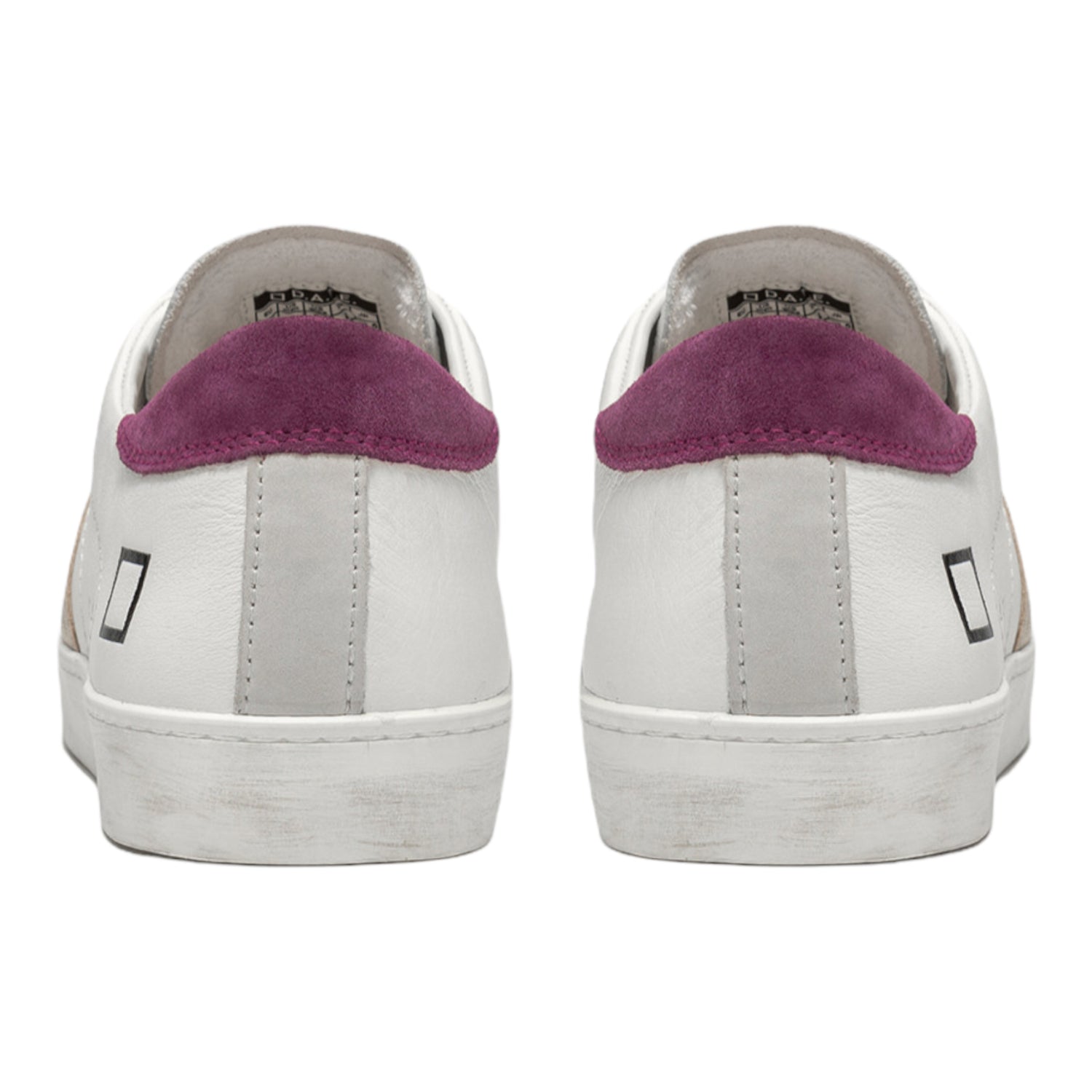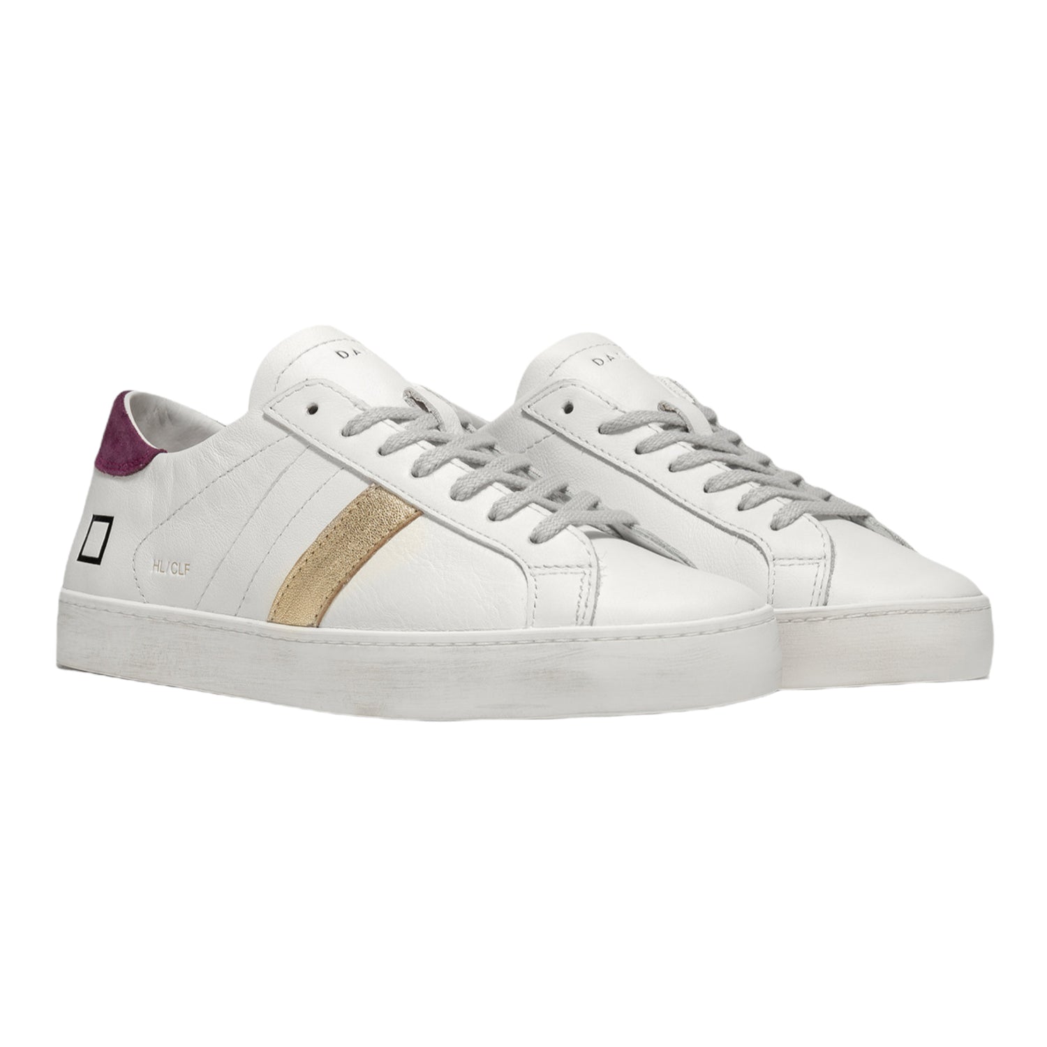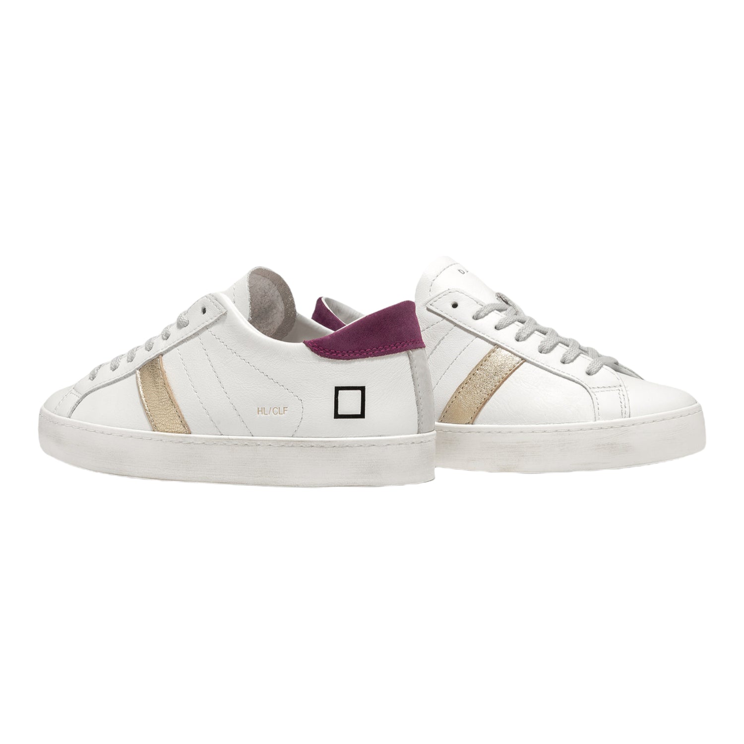 Cod.W361-HL-CA-IP Scarpe basse in pelle dall'effetto used. Sulla linguetta è impressa la scritta D.A.T.E. e sui lati il logo e il modello. Banda laterale in pelle laminata platino e il talloncino posteriore in suede viola. Fodera in pelle e spugna bianca. Soletto interno rialzato di cm 2.5 e suola sporcata per un effetto used. Pellami e materiali made in Italy.