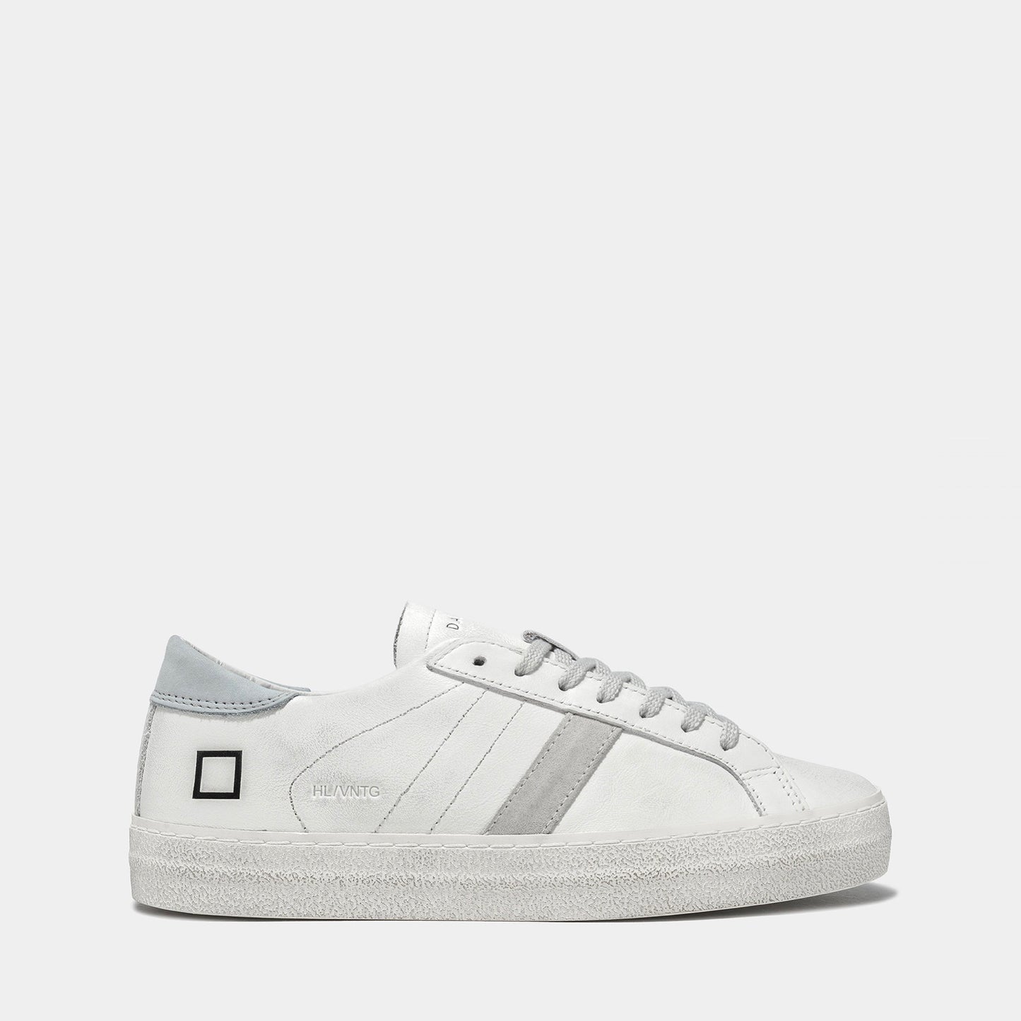 Cod.W361-HL-VC-WS Scarpe basse in pelle dall'effetto used. Sulla linguetta è impressa la scritta D.A.T.E. e sui lati il logo e il modello. Banda laterale in suede ghiaccio e il talloncino posteriore in suede azzurro chiaro. Fodera in pelle e spugna bianca. Soletto interno rialzato di cm 2.5 e suola sporcata per un effetto used. Pellami e materiali made in Italy.