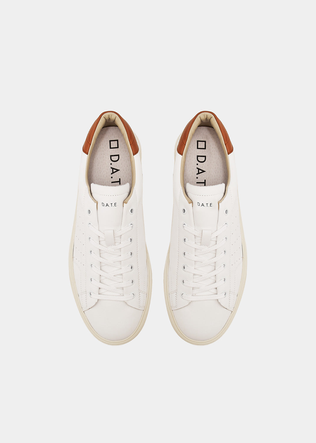 Cod.M381-LV-CA-WI Sneakers in pelle bianca con linguetta con impressa la scritta D.A.T.E., lacci in cotone, codice e logo impressi lateralmente. Talloncino posteriore in pelle color cuoio e fodera interna in pelle e spugna di cotone. Il soletto interno è rialzato da cm 2.5 a 3.5 cm. Tessuti e pellami Made in Italy.