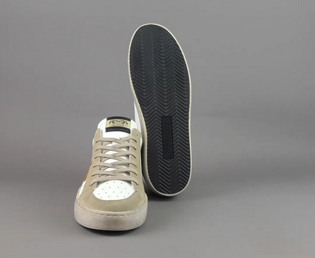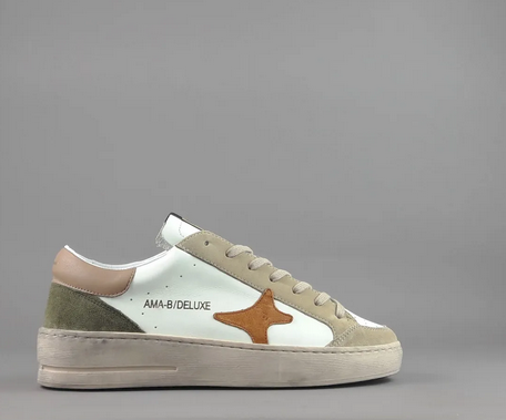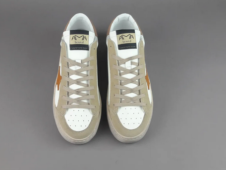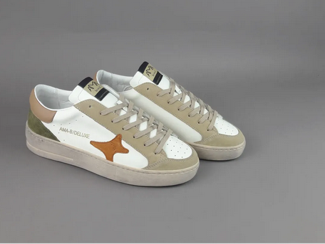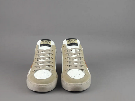 Modello: Slam | Tomaia: Pelle bianca + camoscio beige + accenti arancio e verde militare | Made in Italy | Ama Brand Primavera/Estate 2026