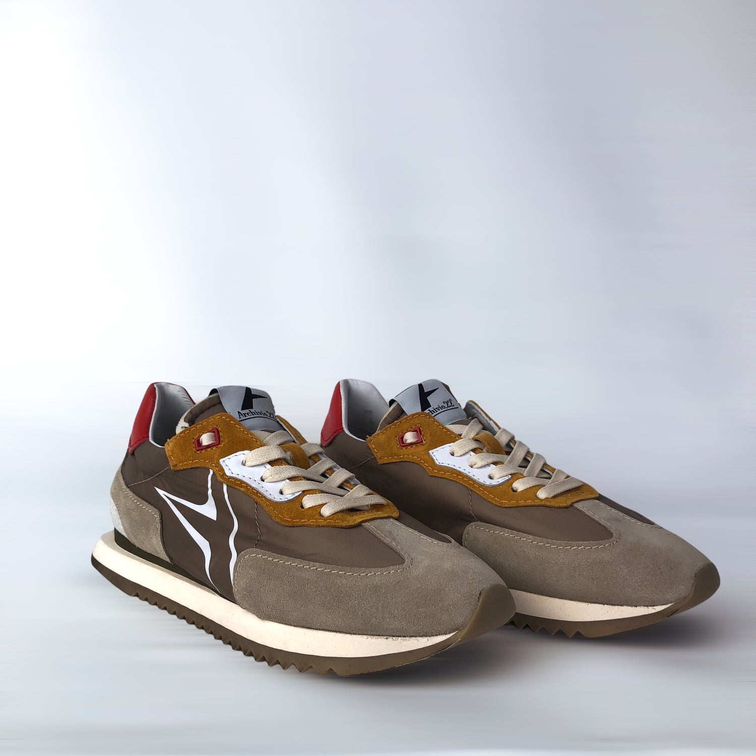 Cod.538 Scarpe dal design ispirato agli anni 80 con tomaia in nylon e dettagli in suede e pelle in colori a contrasto.