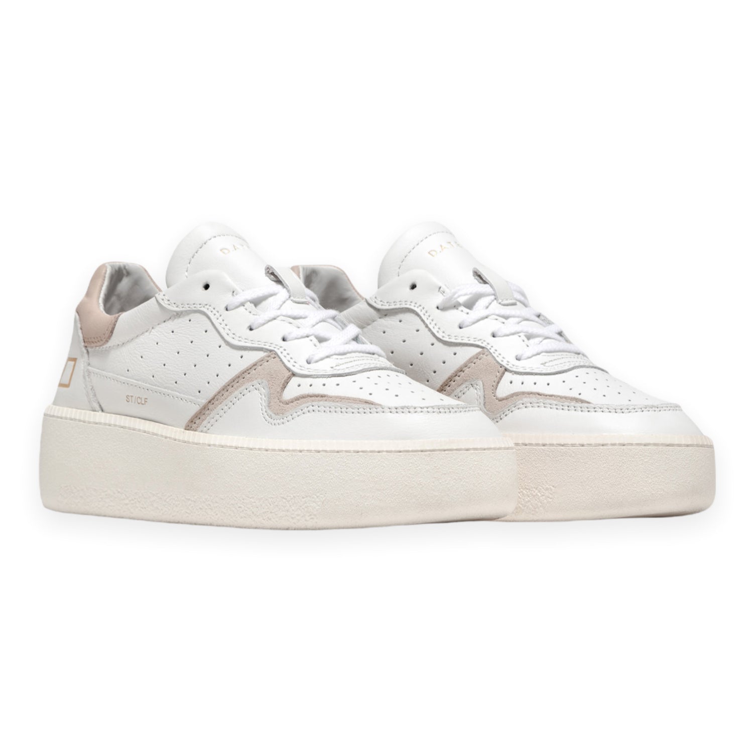 Cod.W361-ST-CA-WP Scarpe in pelle con inserti in suede beige, punta e lati in pelle traforata , scritta D.A.T.E. sulla linguetta e logo quadrato sul lato. Tallonetta in pelle rosa, soletta interna di cm 2.5. Suola in gomma cucita che va dai 3.5 ai 5.5 cm. Pellami e tessuti Made in Italy