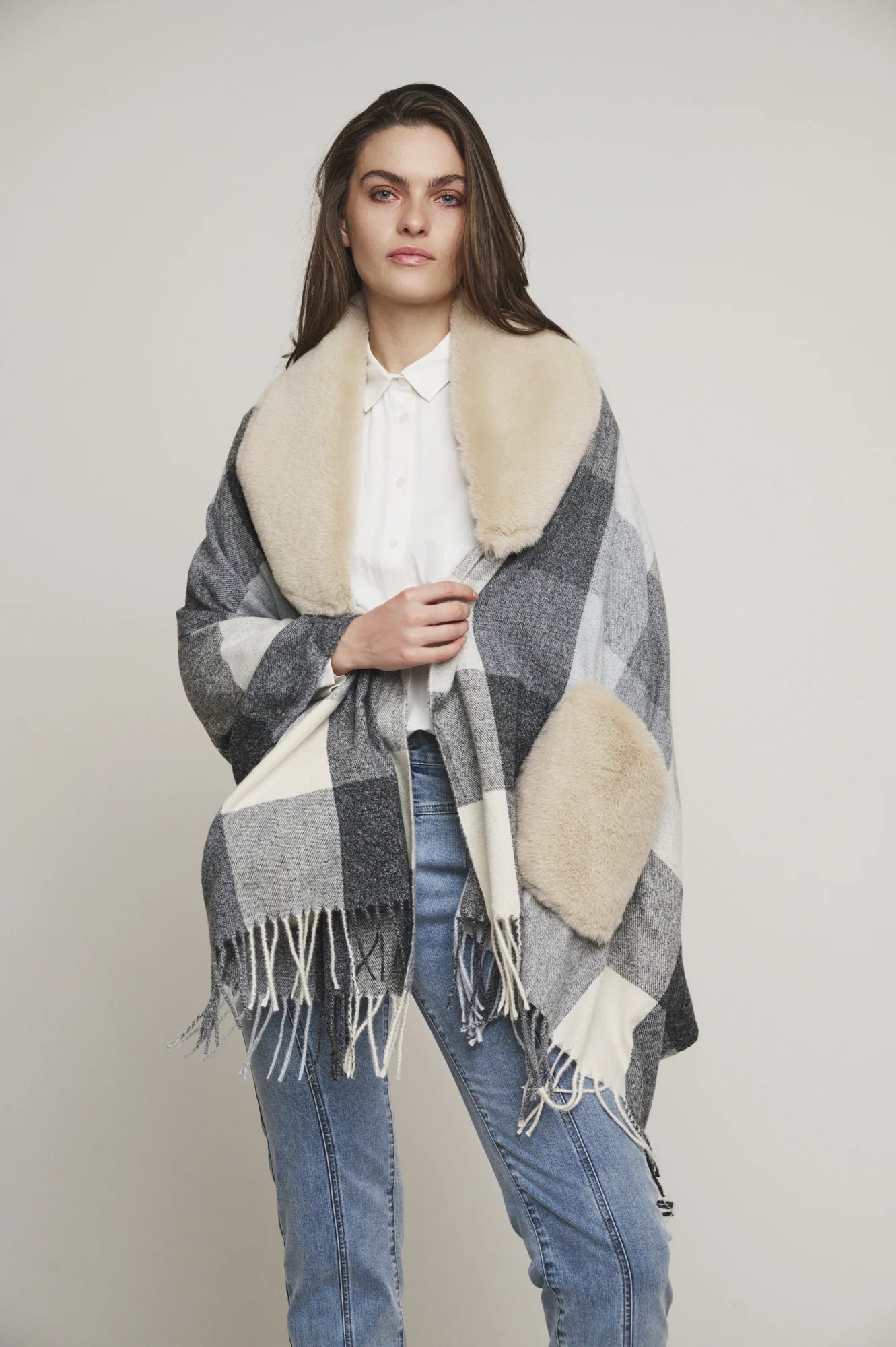 Splendido poncho a quadri con un colletto in finto-pelliccia e tasche in finto-fur che aggiunge un tocco di raffinatezza e glamour al tuo look. Con i suoi dettagli super morbidi, questo poncho ti terrà bene e caldo in questa stagione.