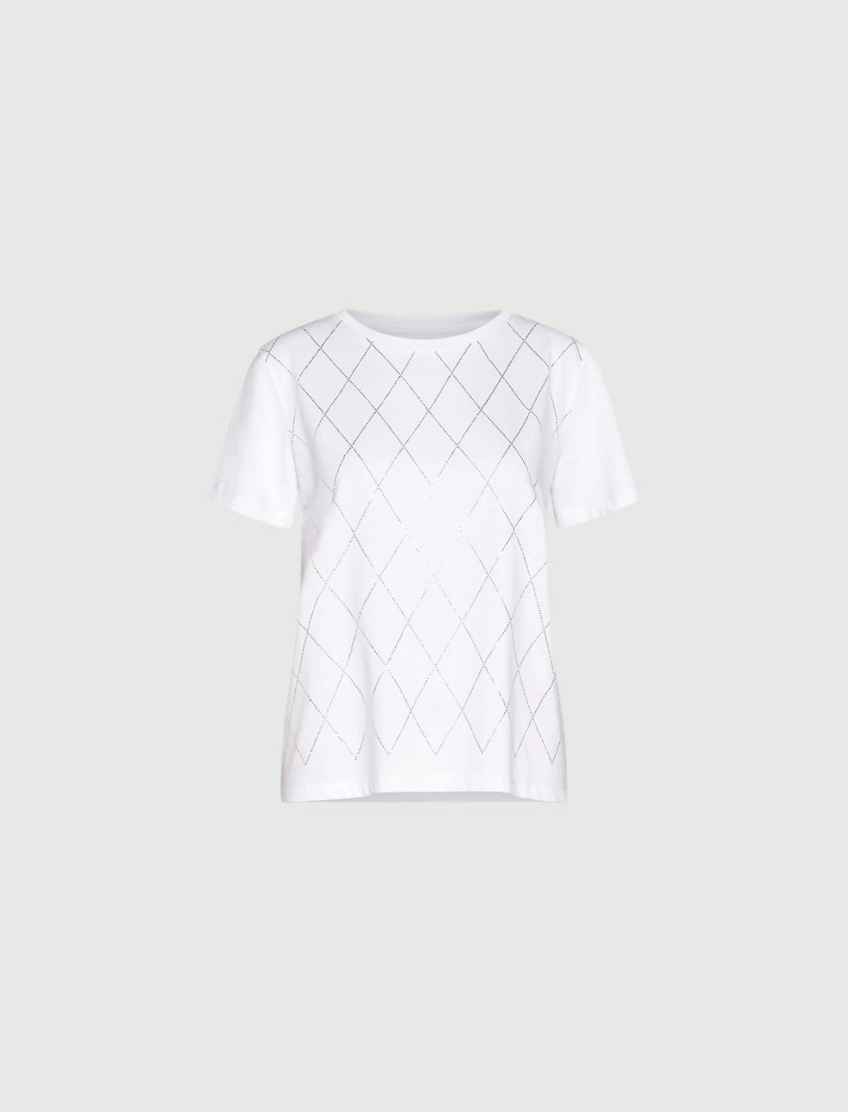 Una t-shirt unica grazie alle applicazioni di strass geometriche. Aggiungi un tocco di brillantezza alla tua giornata con questo dettaglio che fa la differenza. Non solo una t-shirt semplice, ma un'opzione elegante e di tendenza. Ottieni il look perfetto con la nostra t-shirt.