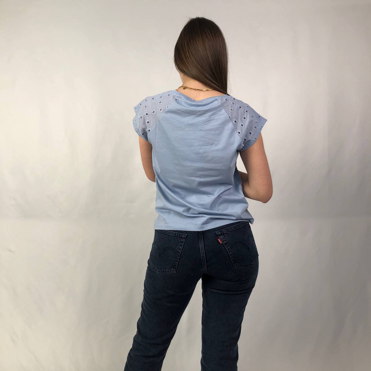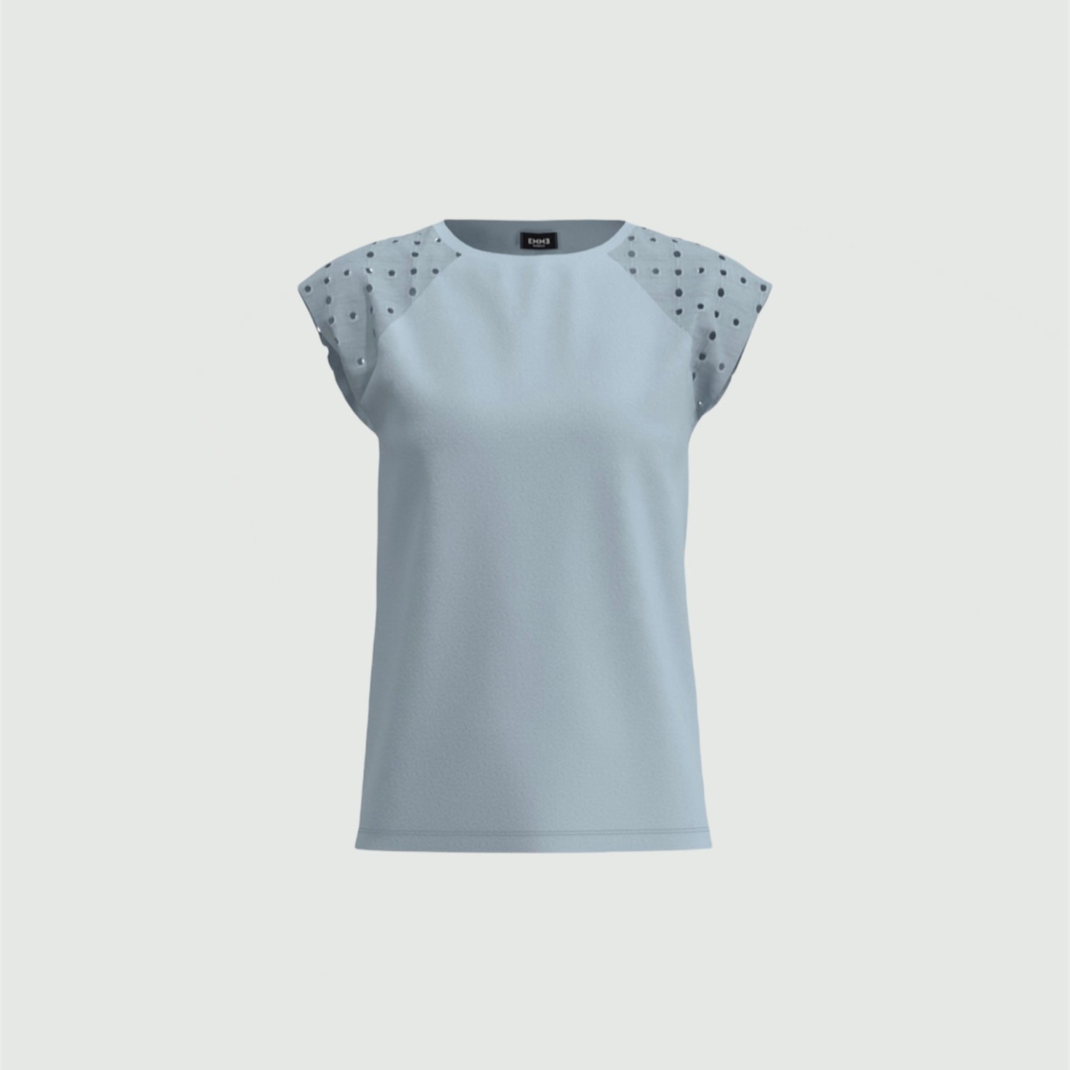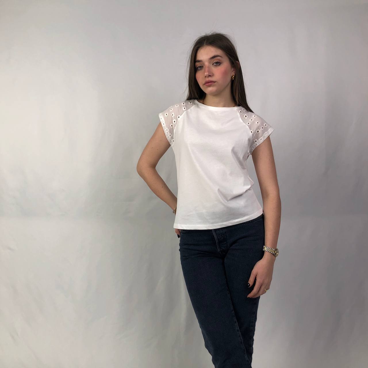 Cod.SEDE T-shirt in jersey di cotone con maniche raglan in Sangallo, scollo rotondo, linea dritta.