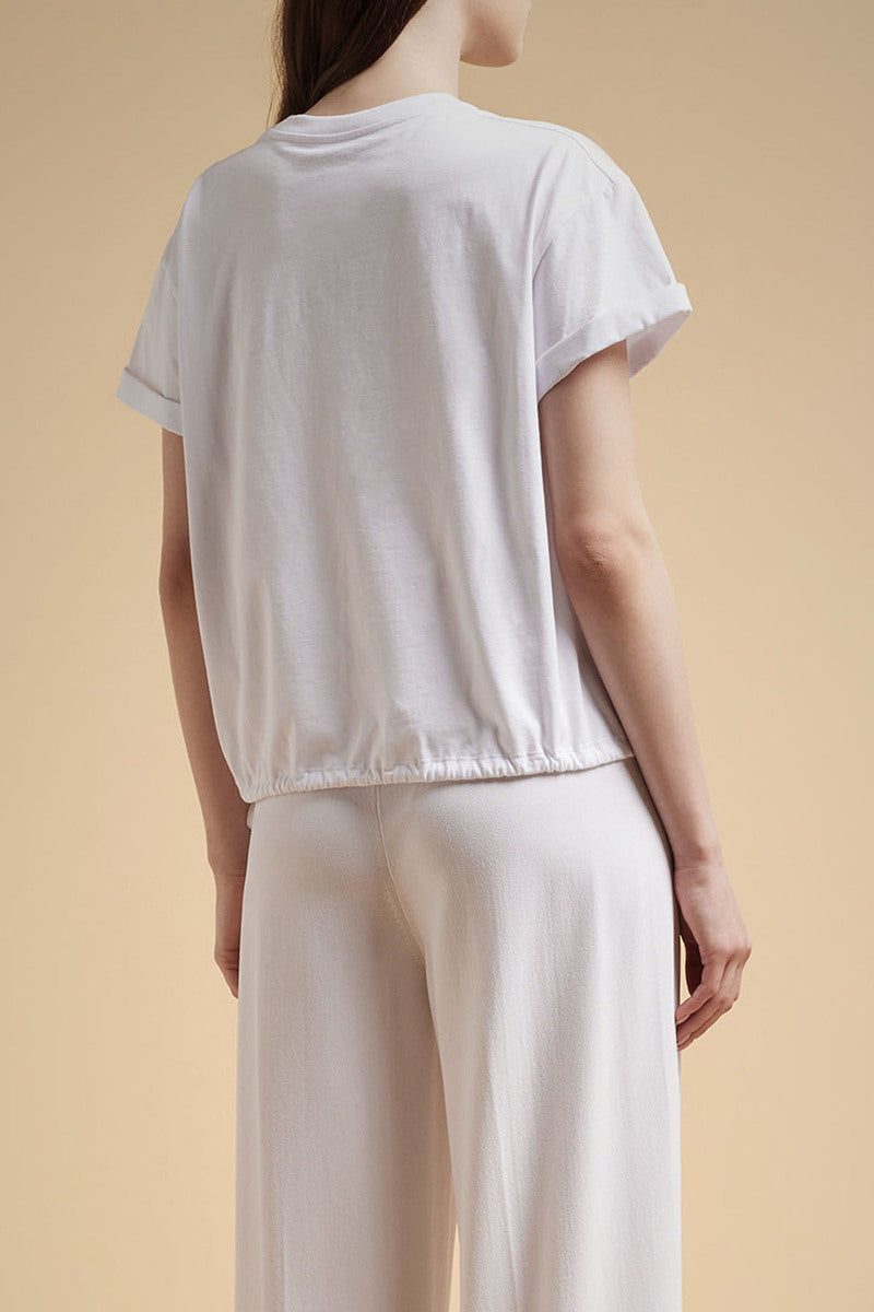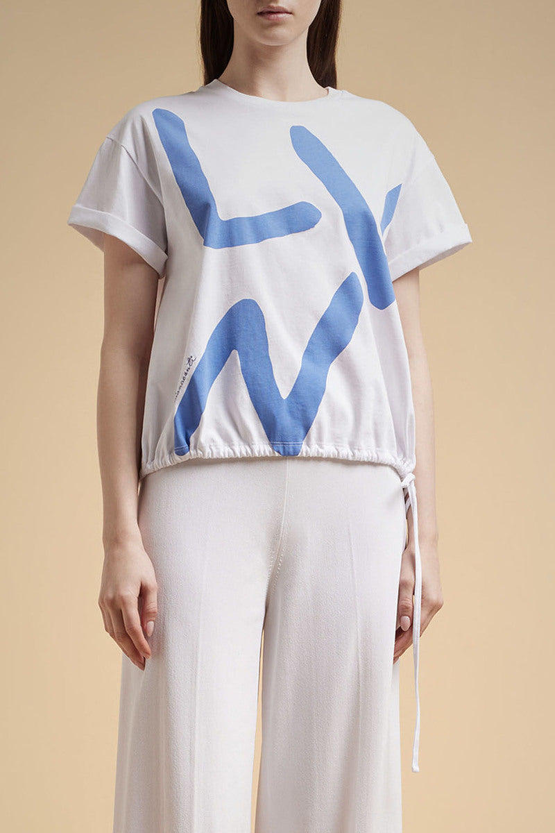 Cod.F3SW37 T-shirt in jersey di cotone, girocollo, spalla scesa e manica corta con coulisse al fondo. Stampa lettering frontale e ricamo logo