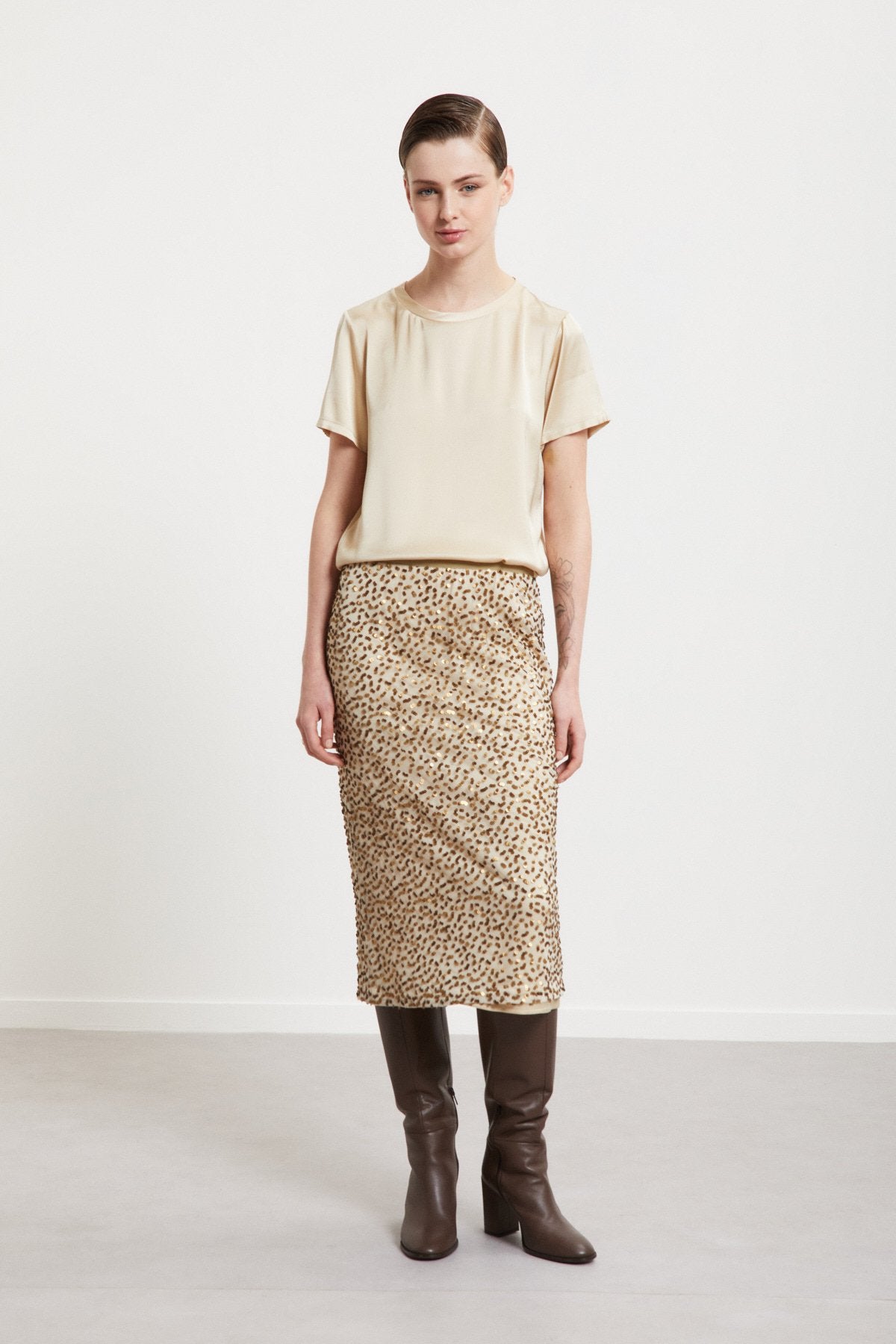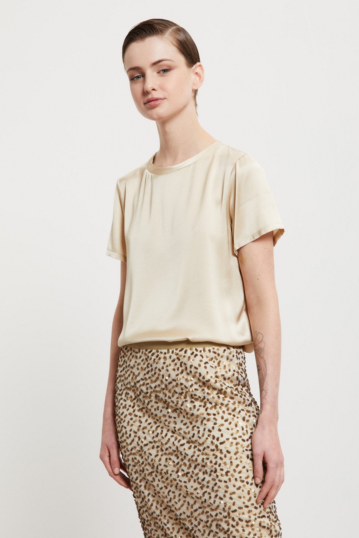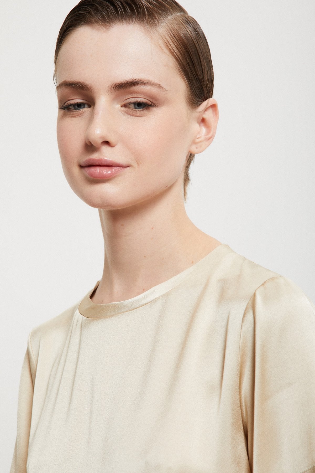 T-shirt fluida in raso di viscosa Ottod'Ame che unisce leggerezza e eleganza in un capo versatile per ogni occasione. Il tessuto lucido conferisce un tocco raffinato, mentre la vestibilità morbida garantisce comfort per tutta la giornata.